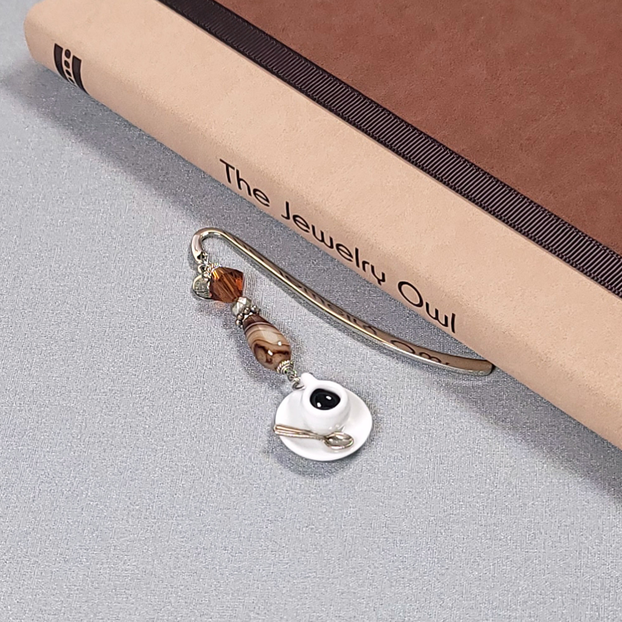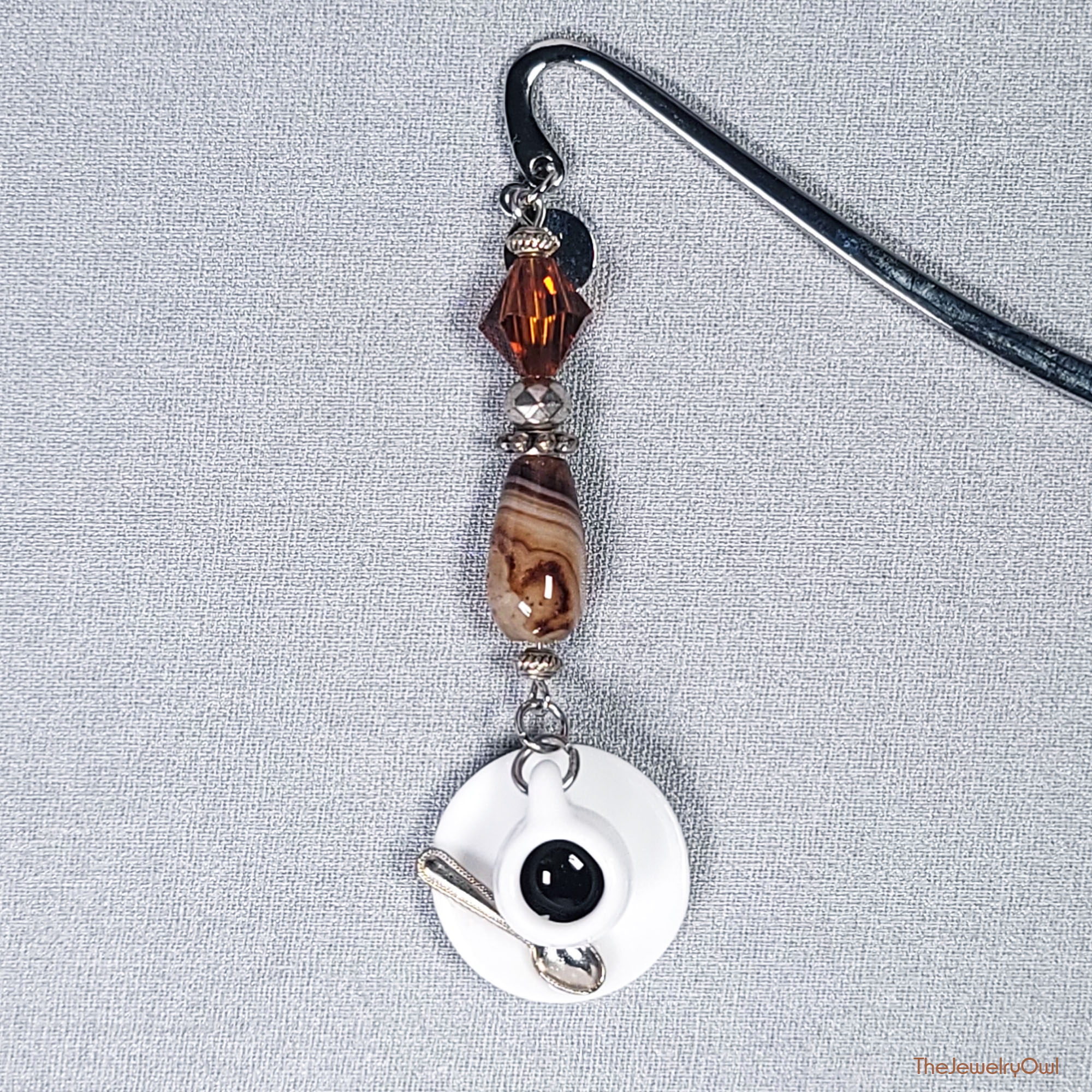 This shepherd's hook bookmark featuring a with ceramic coffee cup and brown swirl teardrop agate bead will be the perfect gift for all who love to read while having a good cup of coffee.