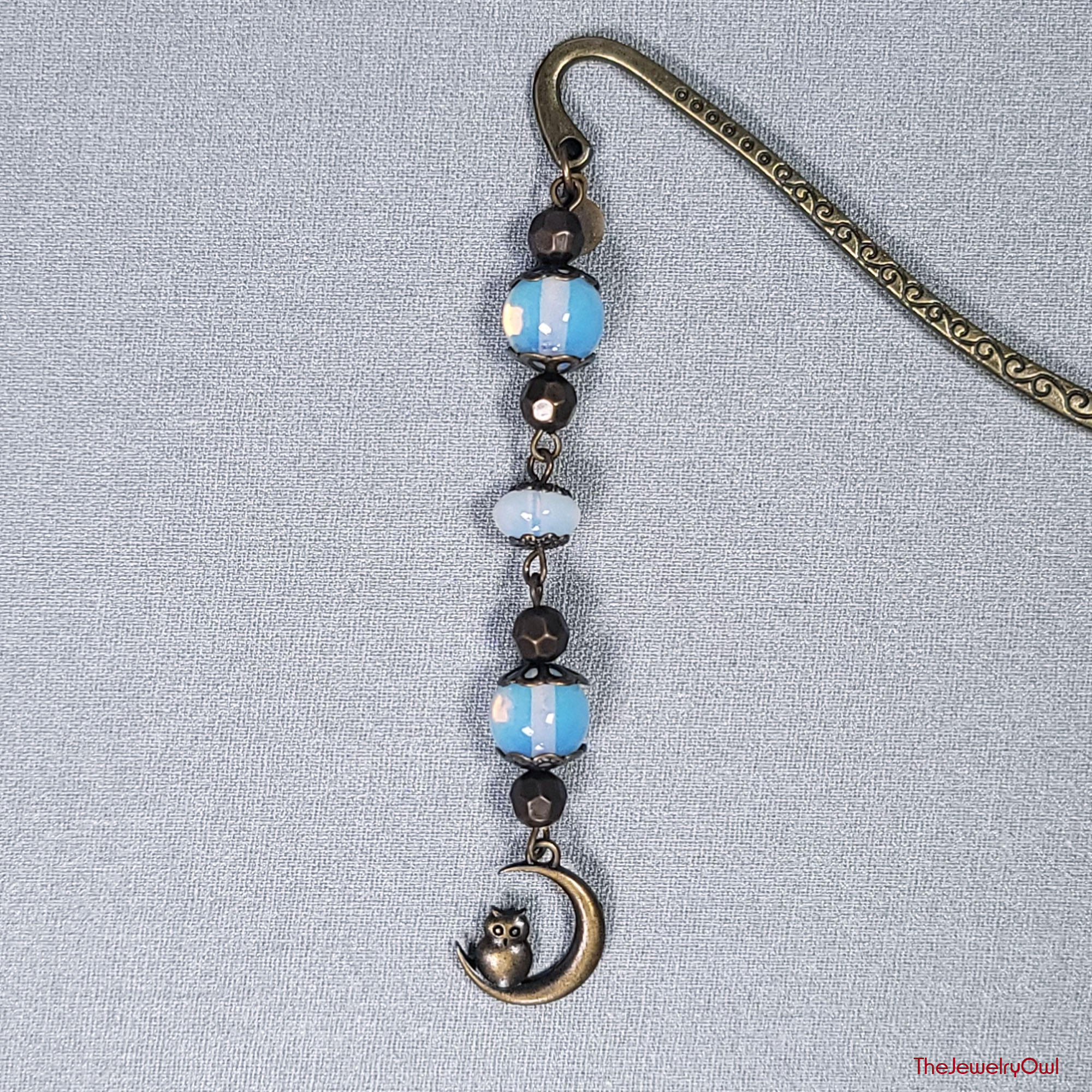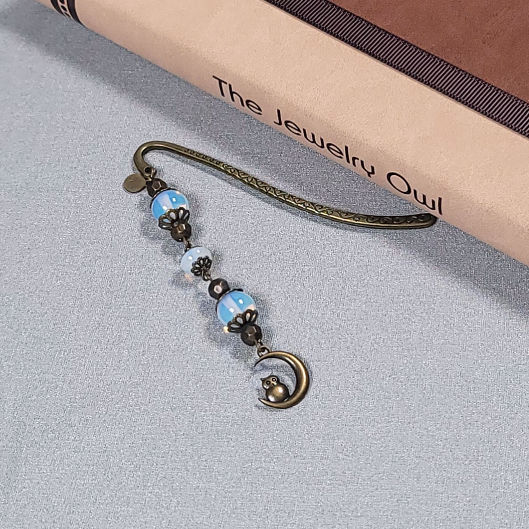 This one of a kind beaded bookmark features moonstone glass beads and a mini crescent moon with an owl. Ideal gift for a night reader.