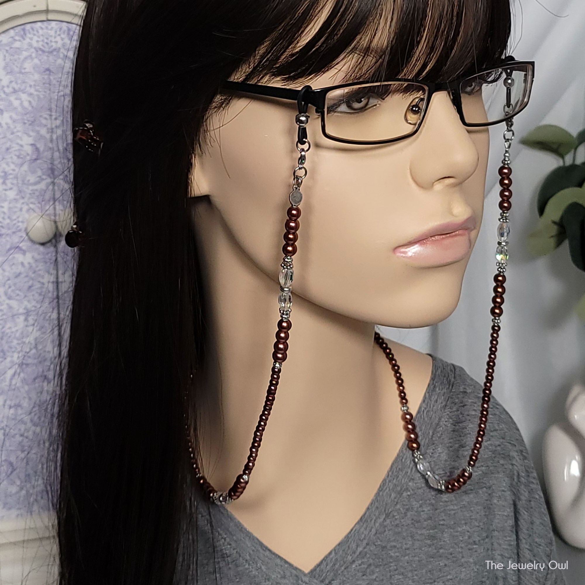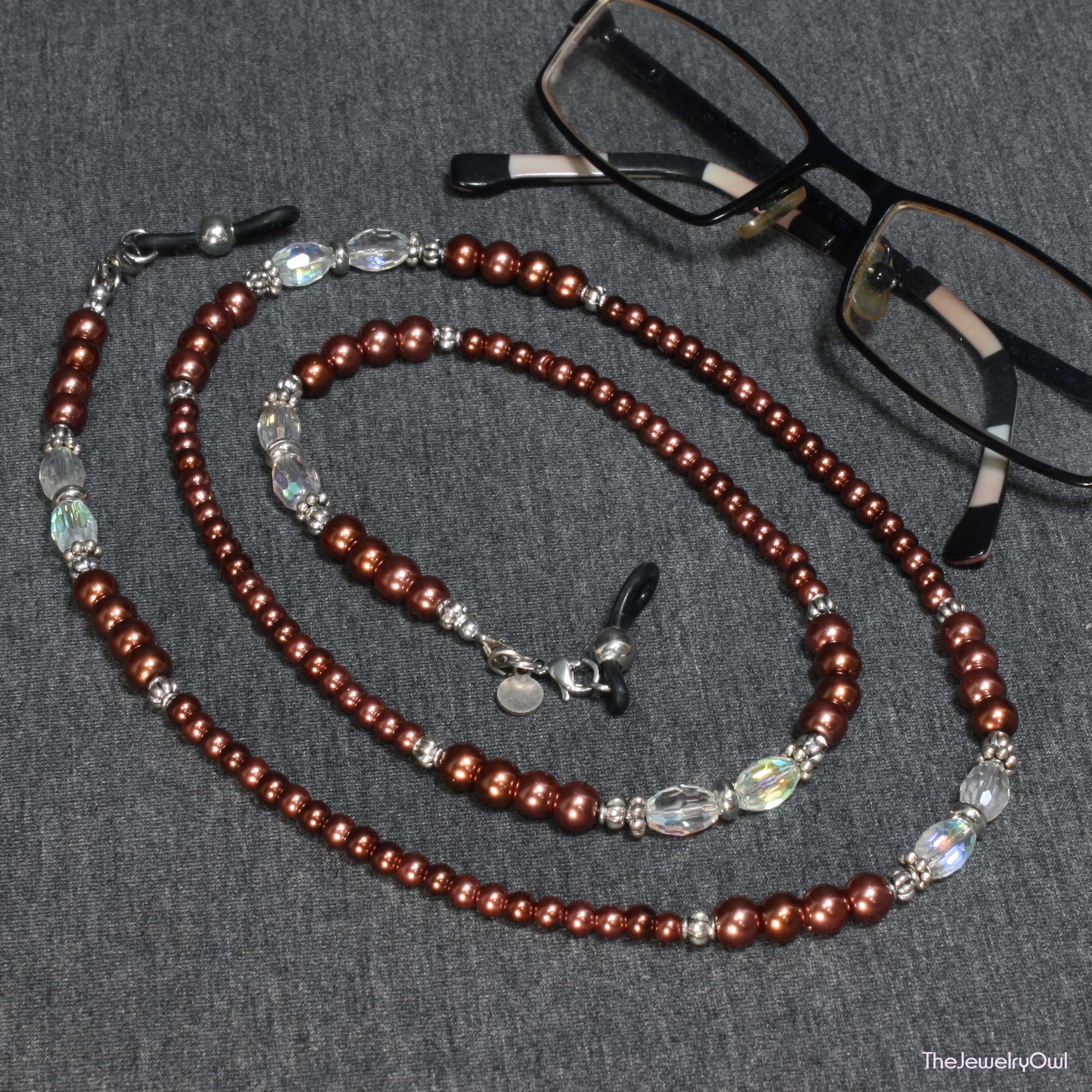 Are you looking for a great gift for someone who misplaces or forgets their reading glasses? Look no further than this lovely rose copper pearl & clear AB beaded eyeglass chain!