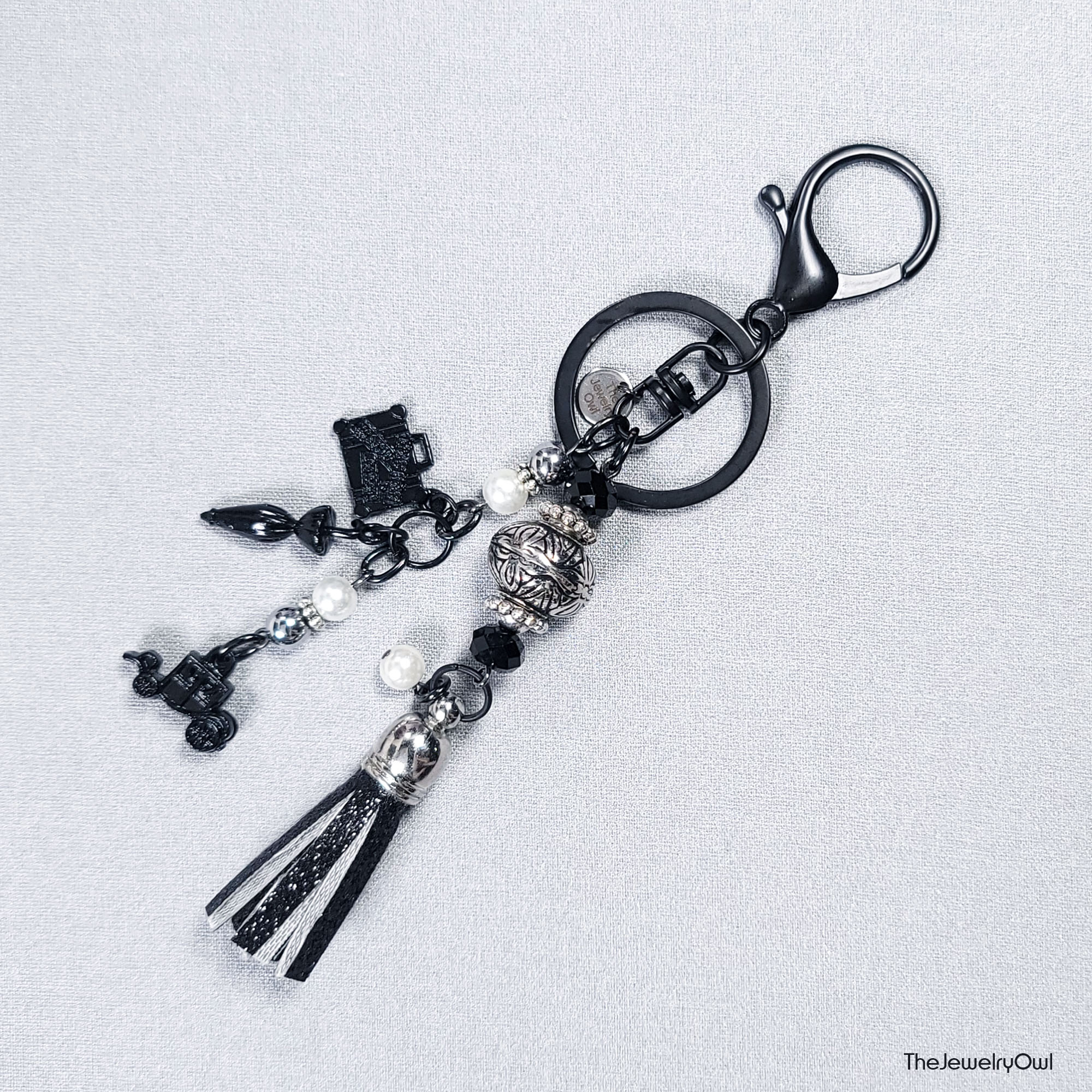 For the traveler in your life, our black purse charm dangle features an old time horse drawn carriage, suitcase and an umbrella. Silver and white accent beads and a black glitter tassel.