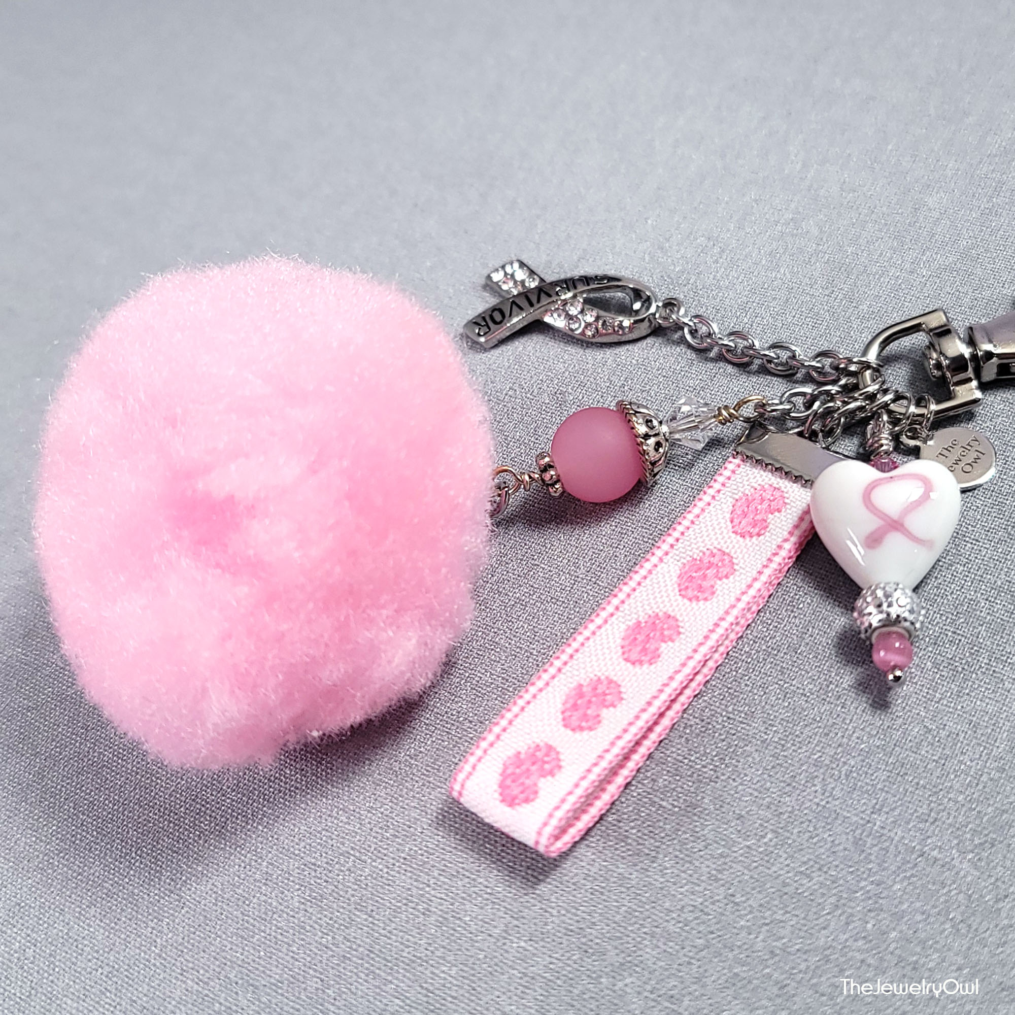 Show your support for Breast Cancer Awareness with our purse dangle featuring a rhinestone silver "survivor" awareness ribbon and a beautiful white glass heart bead.