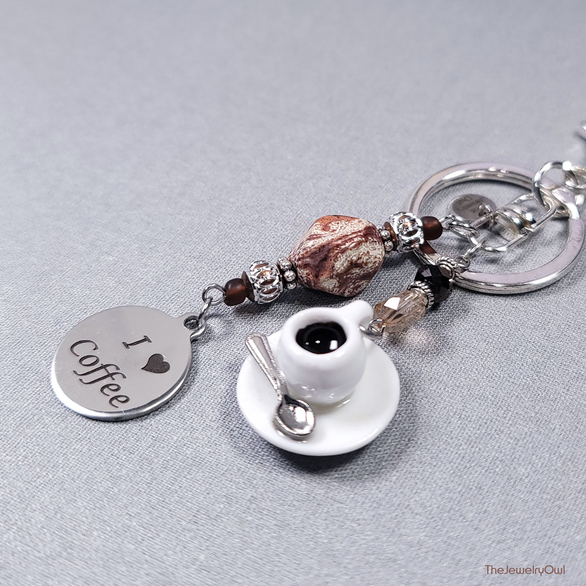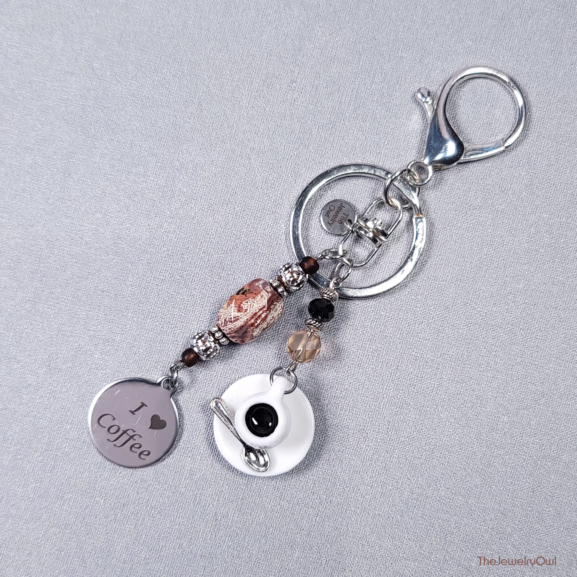 Ideal gift for the coffee lover in your life. Our one of a kind bag dangle features a porcelain coffee cup and a "I 🖤 Coffee" metal charm.