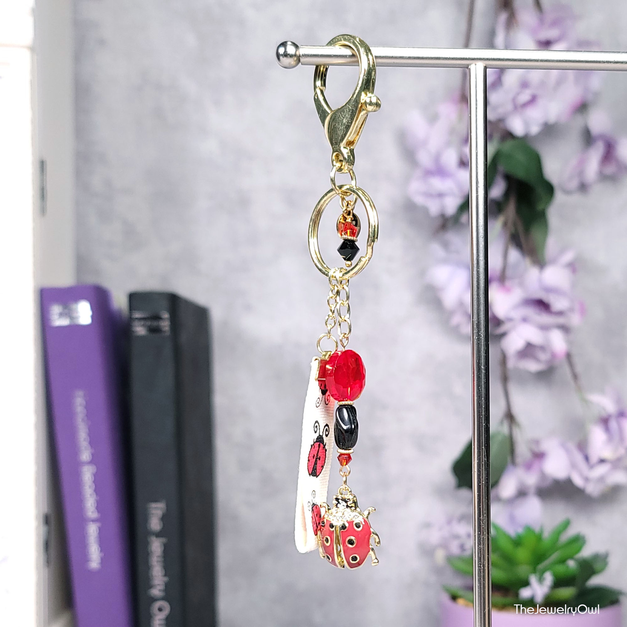 Bring a little luck where ever you go with this one of a kind ladybug bag dangle featuring a ladybug ribbon and metal charm.