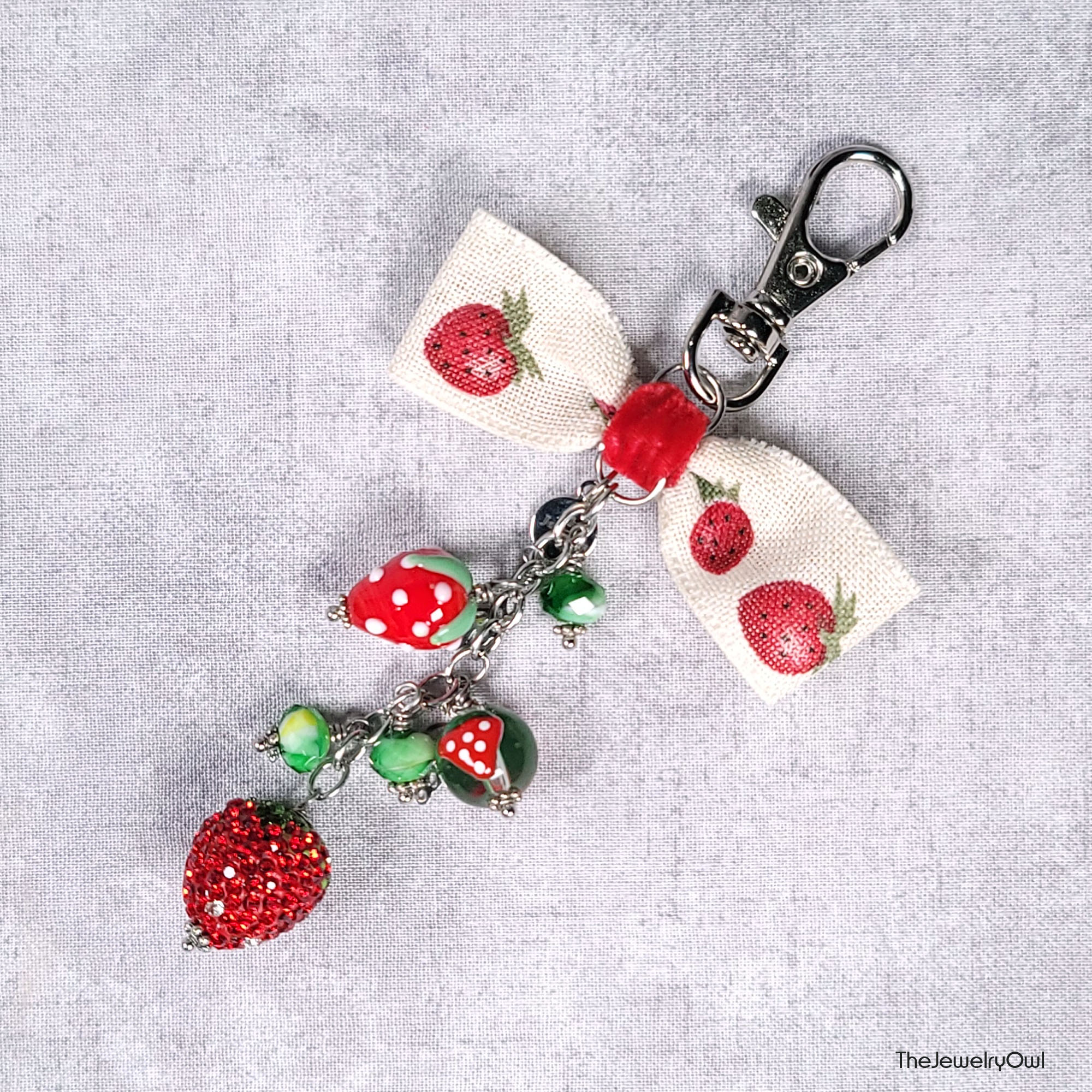 One of a kind purse charm dangle feature a strawberry printed ribbon, glass lampwork strawberry beads and a large rhinestone strawberry for added sparkle.