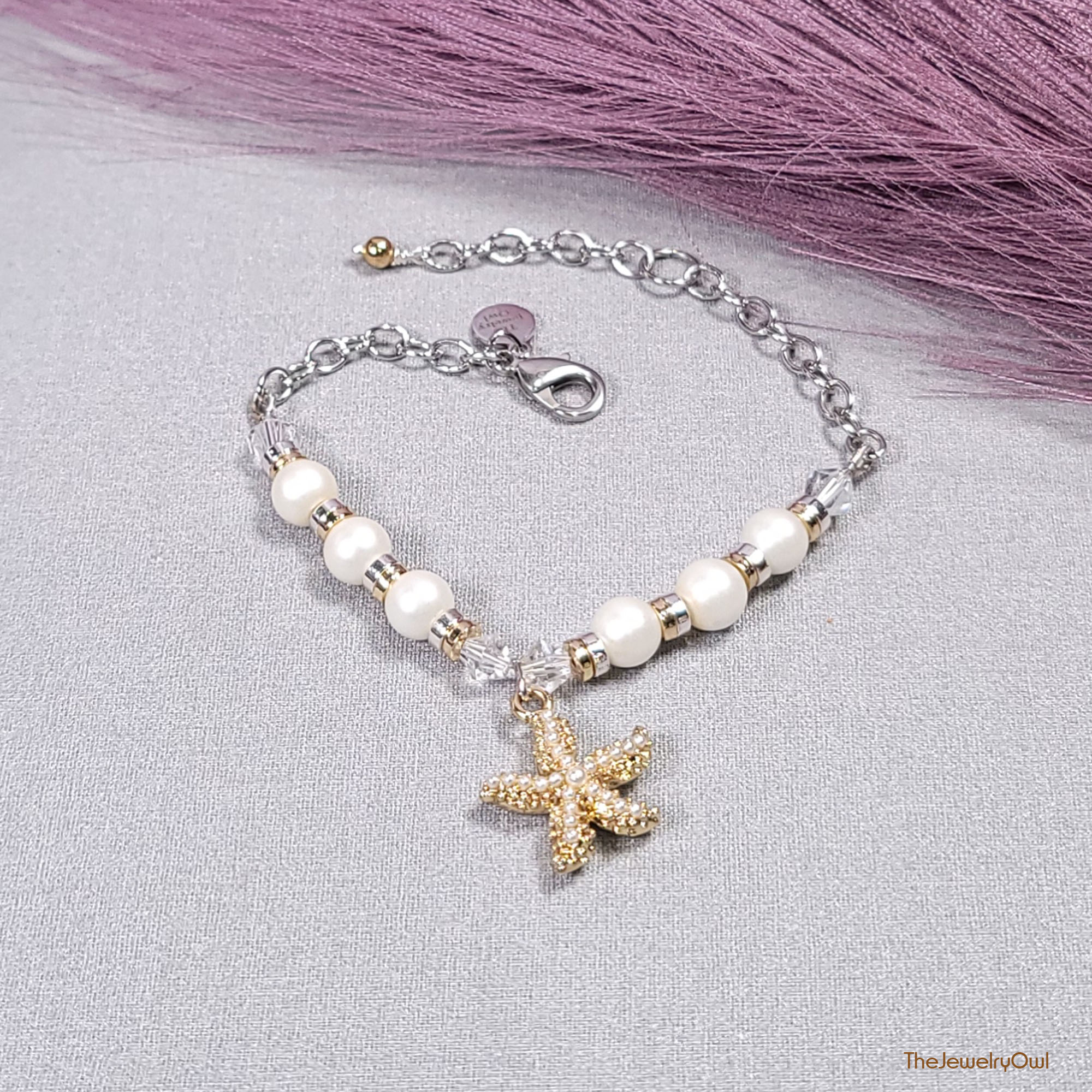 Glass pearl bead and chain bracelet feature a gold-tone and pearl starfish charm dangle for a nautical look.
