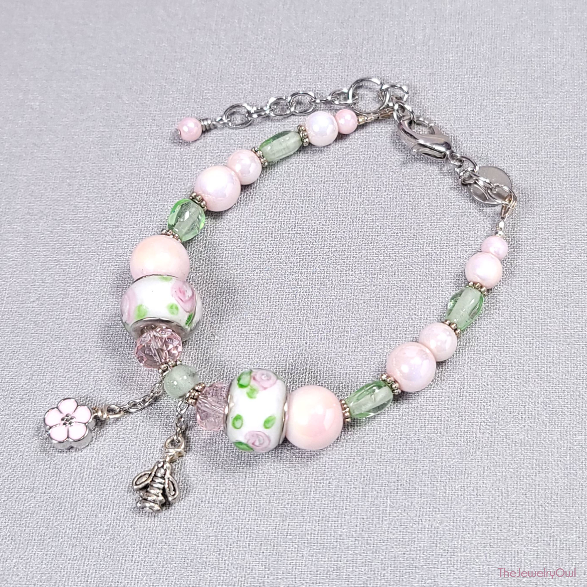 Enjoy a little bit of Spring with our one of a kind pink glass pearl bracelet with a pink flower and small bee dangle.
