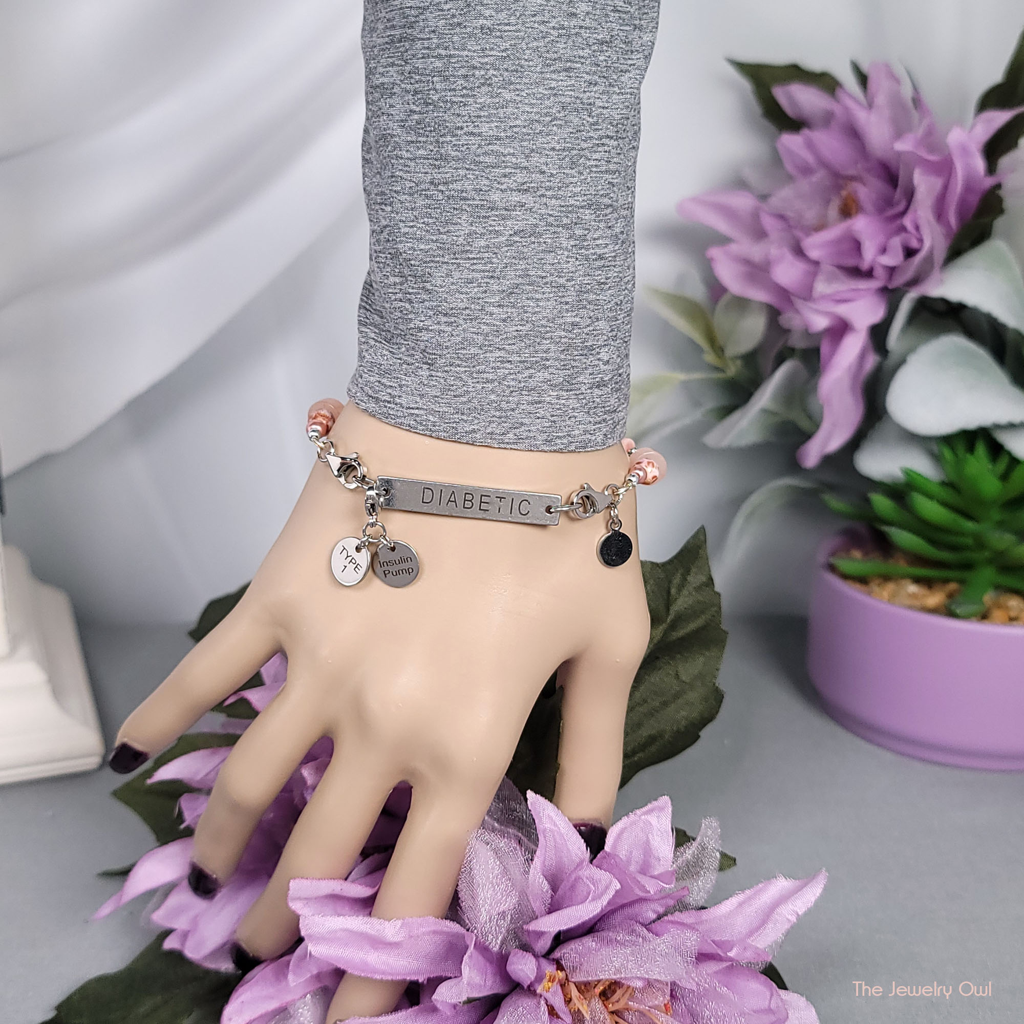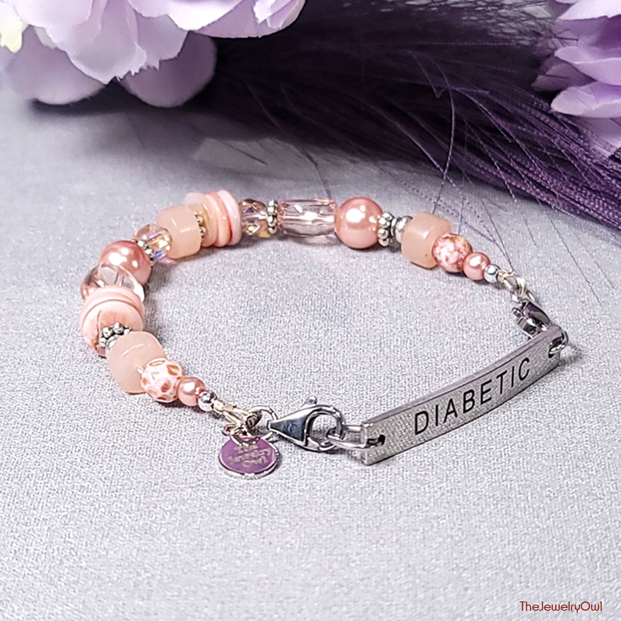 Interchangeable bracelet features an array of blush pink glass beads, pink quartz and Czech beads for a very feminine look. A simple and elegant way to dress up your medical ID tag or choose our slim Diabetic Tag.