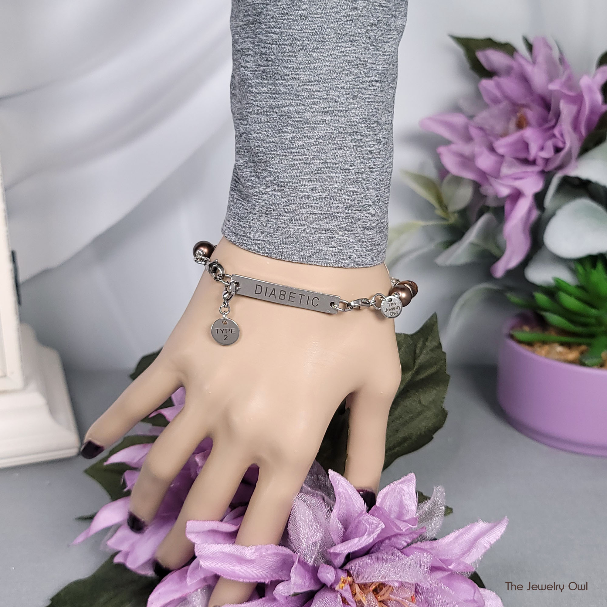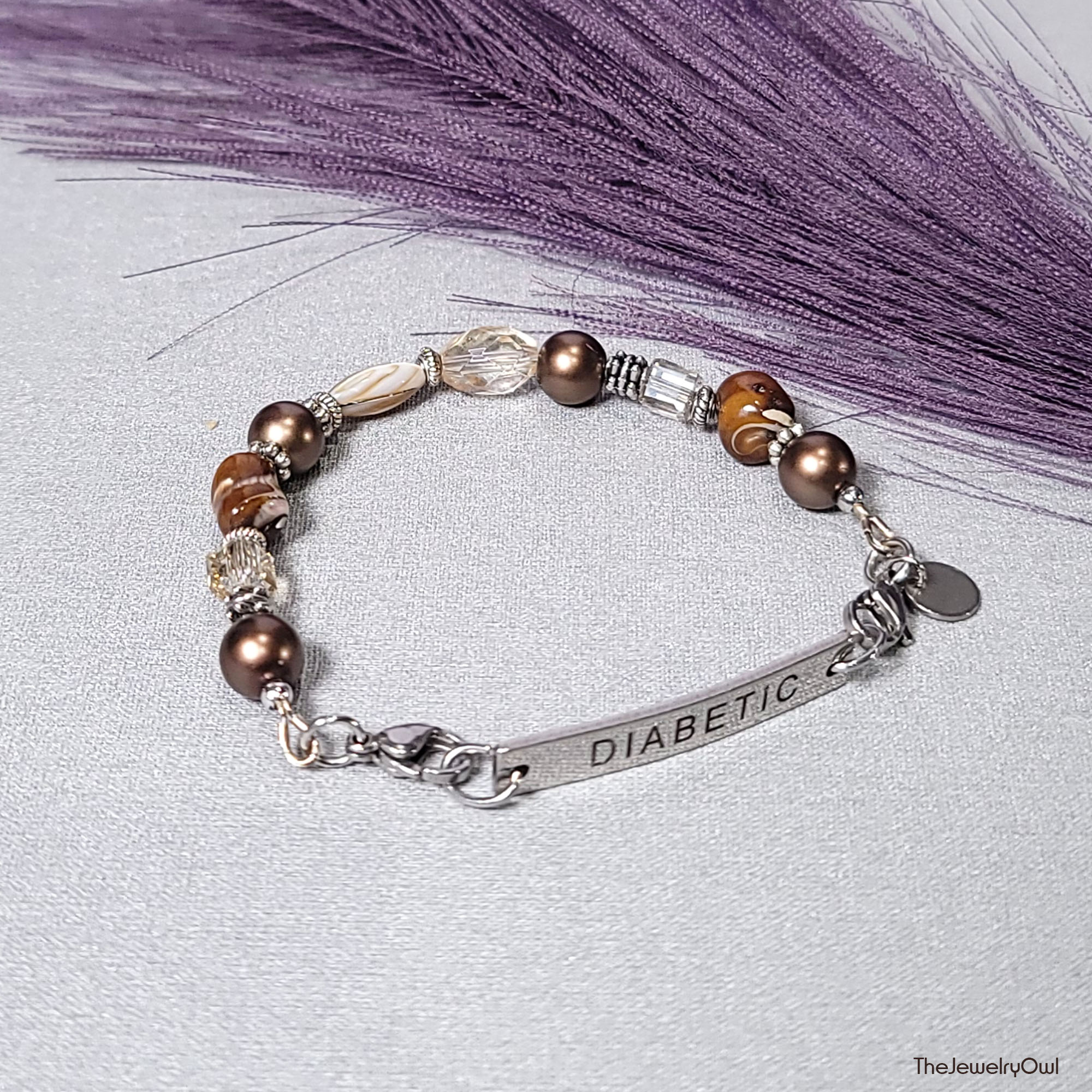 This stylish bracelet is adorned with an array of brown nugget glass beads, faux pearls, and silver accent beads. The lightweight and slim design makes it comfortable to wear all day long. You can add our Diabetic Tag or use one you already have.
