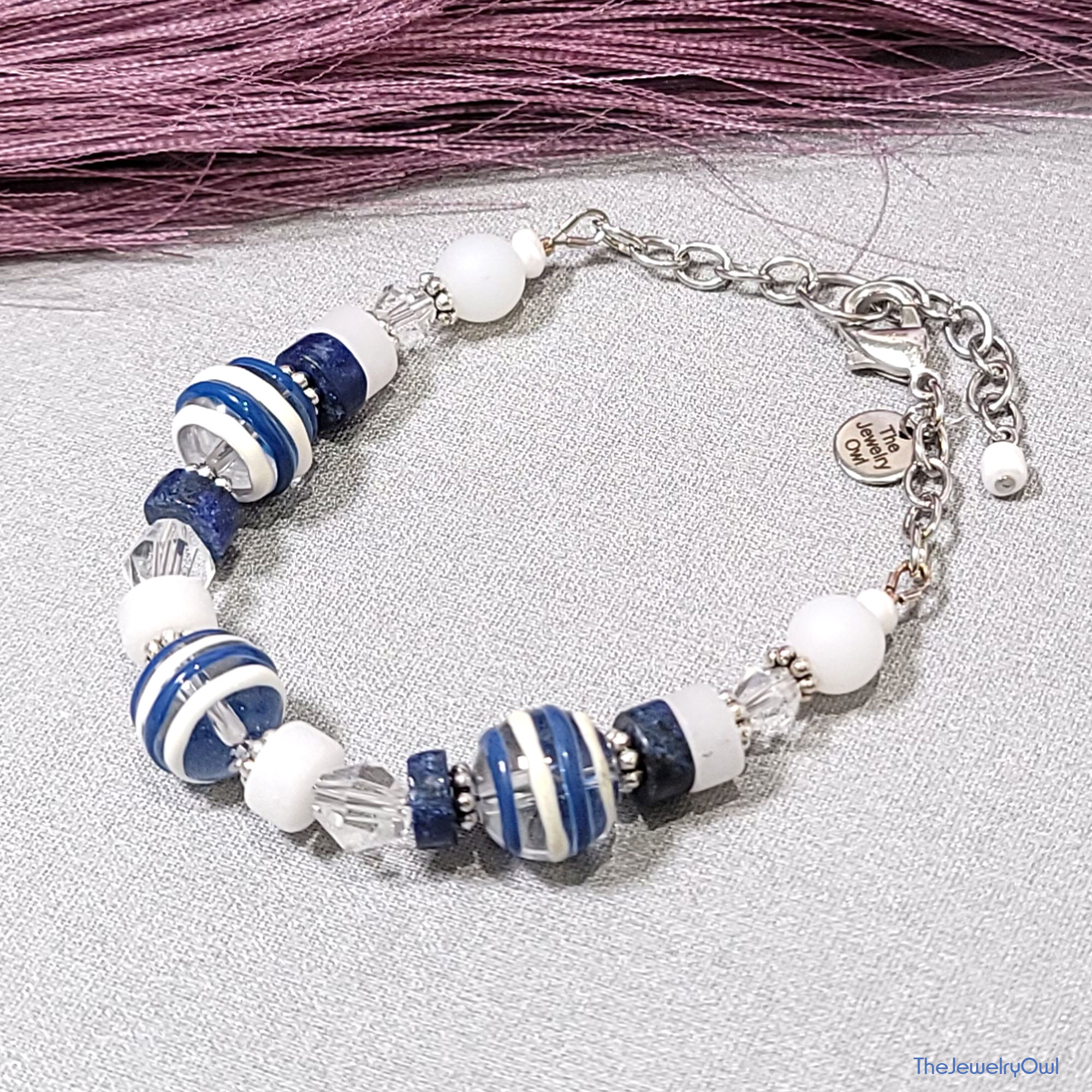 A perfect accessory to wear with your favorite denim jeans. Our beaded bracelet features large navy blue and white striped clear glass beads, blue dyed lapis and white quartz.