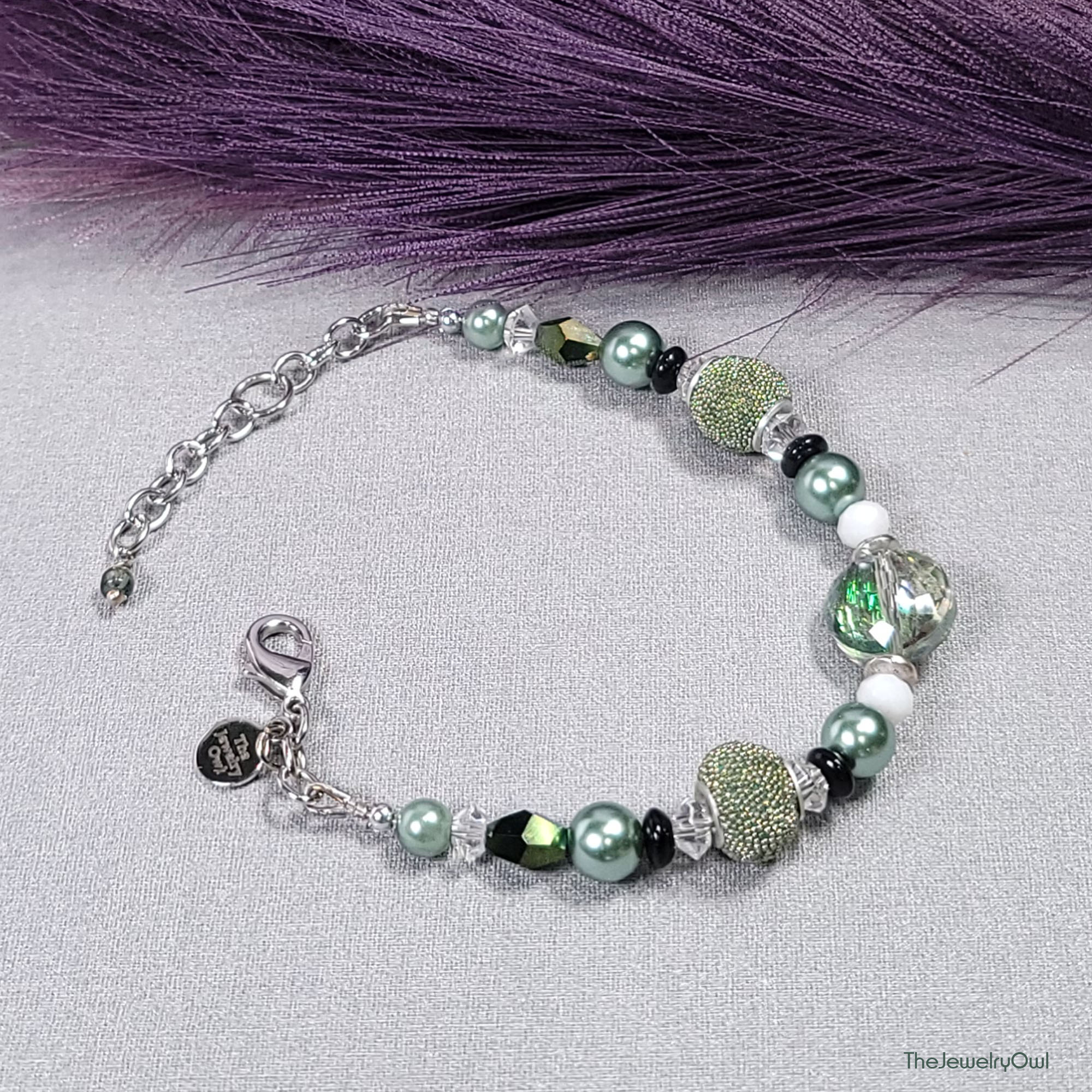 Beaded bracelet features an array of mixed sage green glass beads for a unique one-of-a-kind boho bracelet.