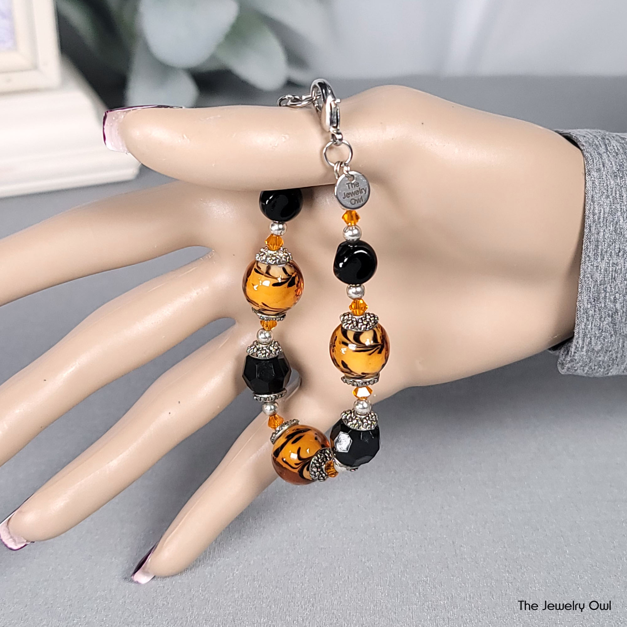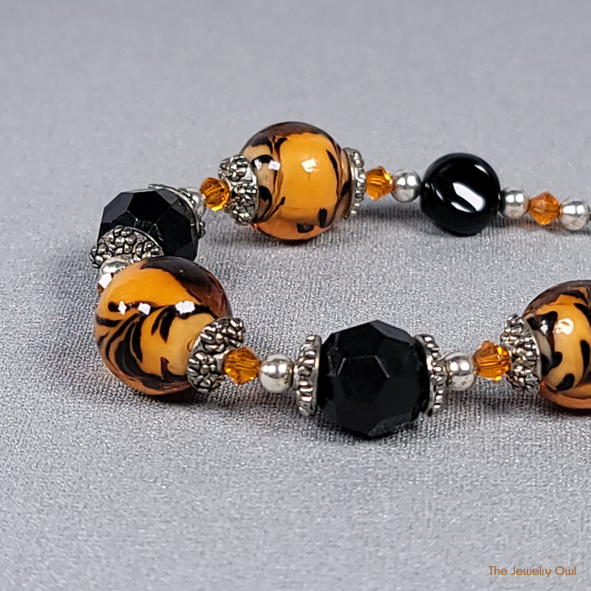 For the daring, this bold orange and black beaded bracelet is designed to make a statement. Featuring large vibrant orange glass beads with black swirl.