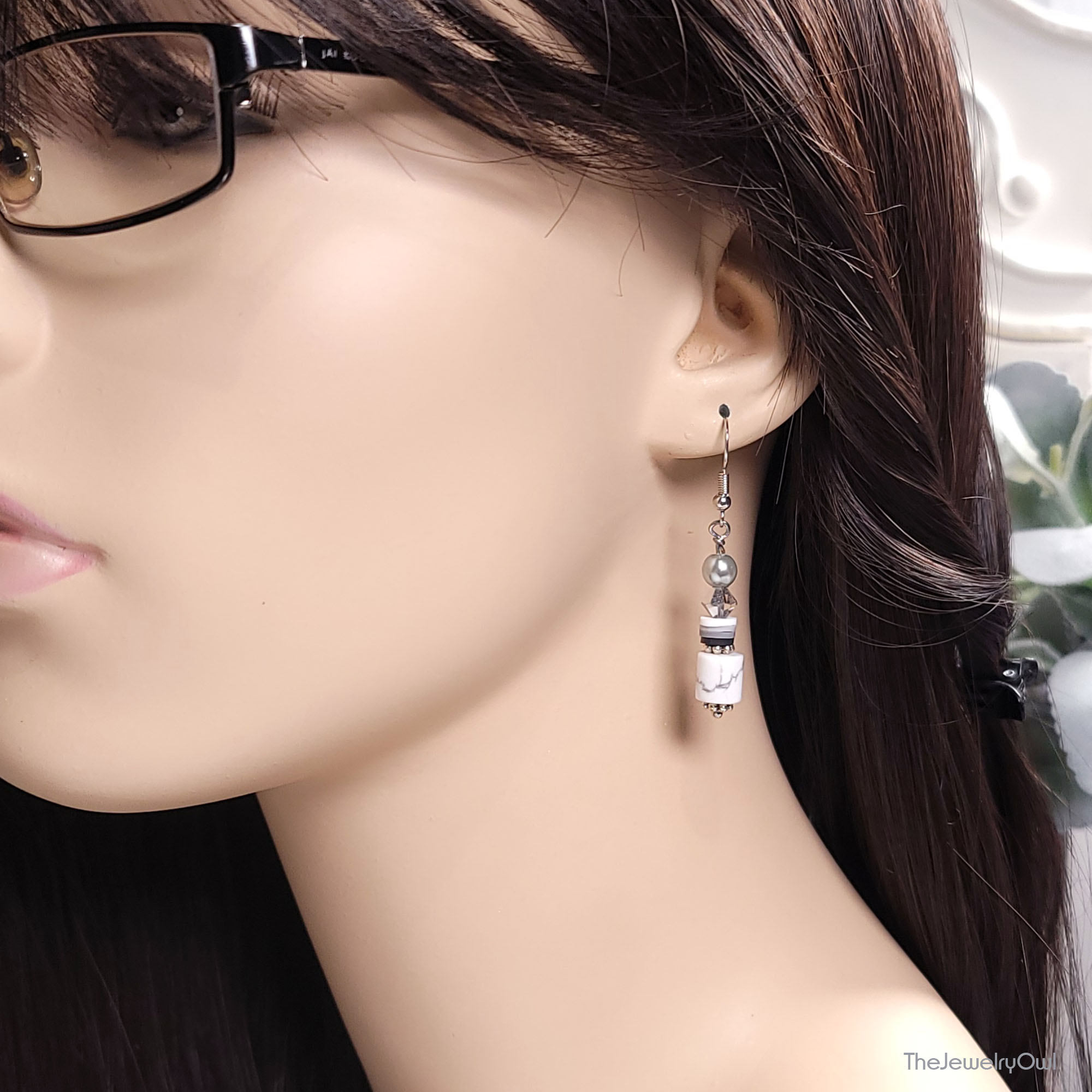 Dangle earrings feature a combination of white howlite, glass and clay beads. White howlite symbolizes compassion, warmth, and open-minded thinking.