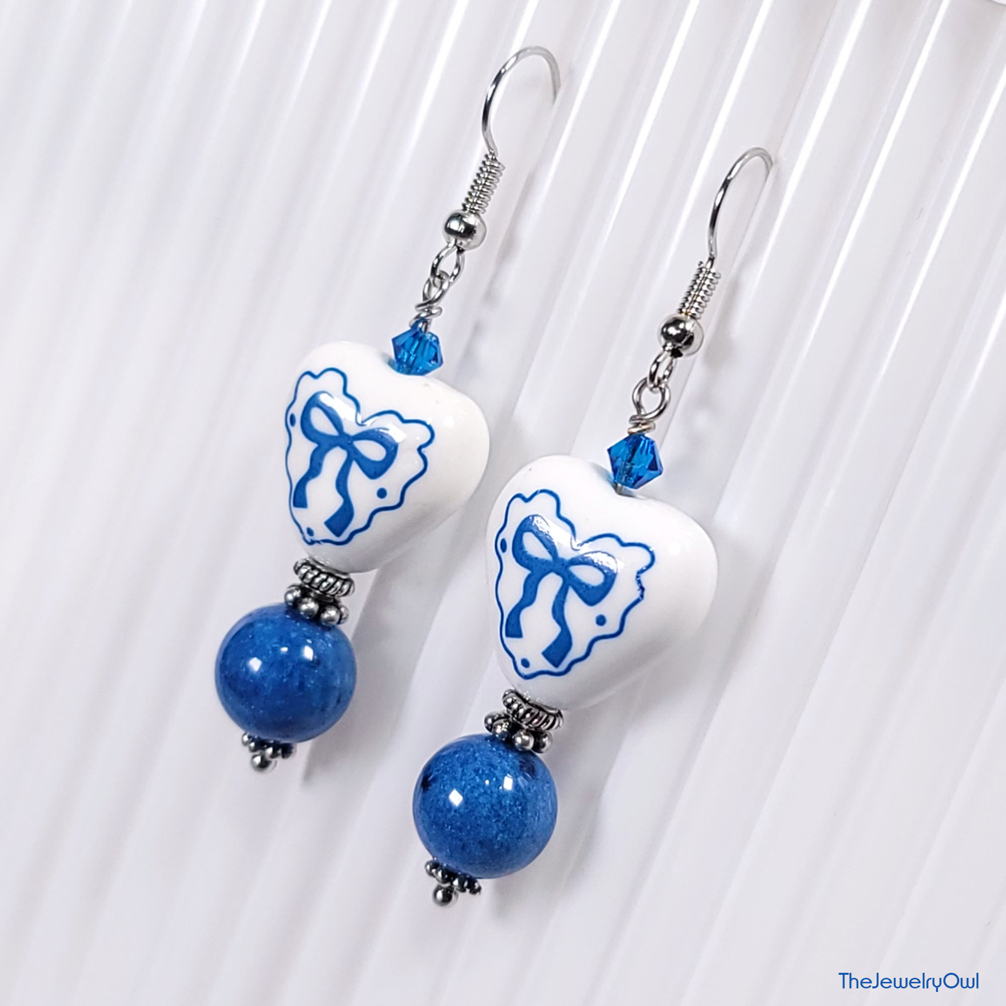 Add a romantic touch with these coquette inspired dangle earrings featuring ceramic heart with blue bow.