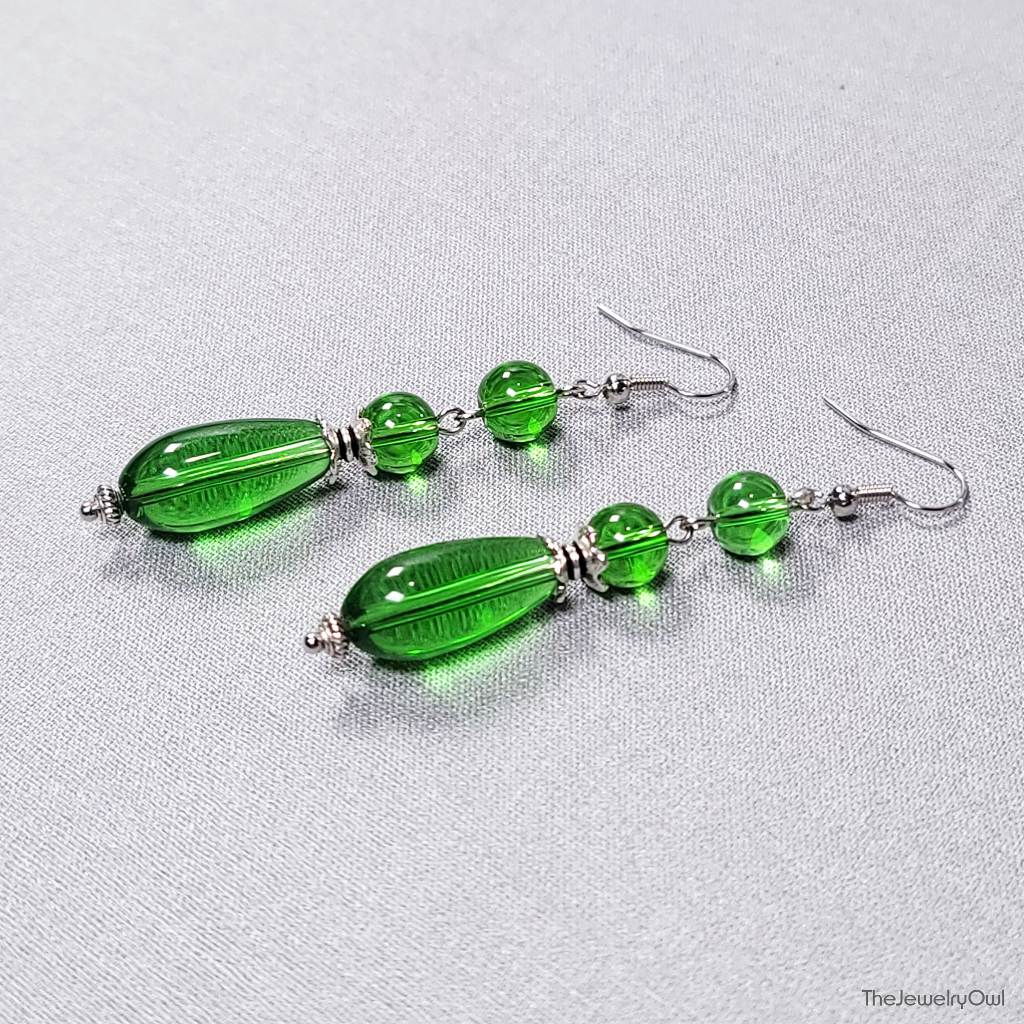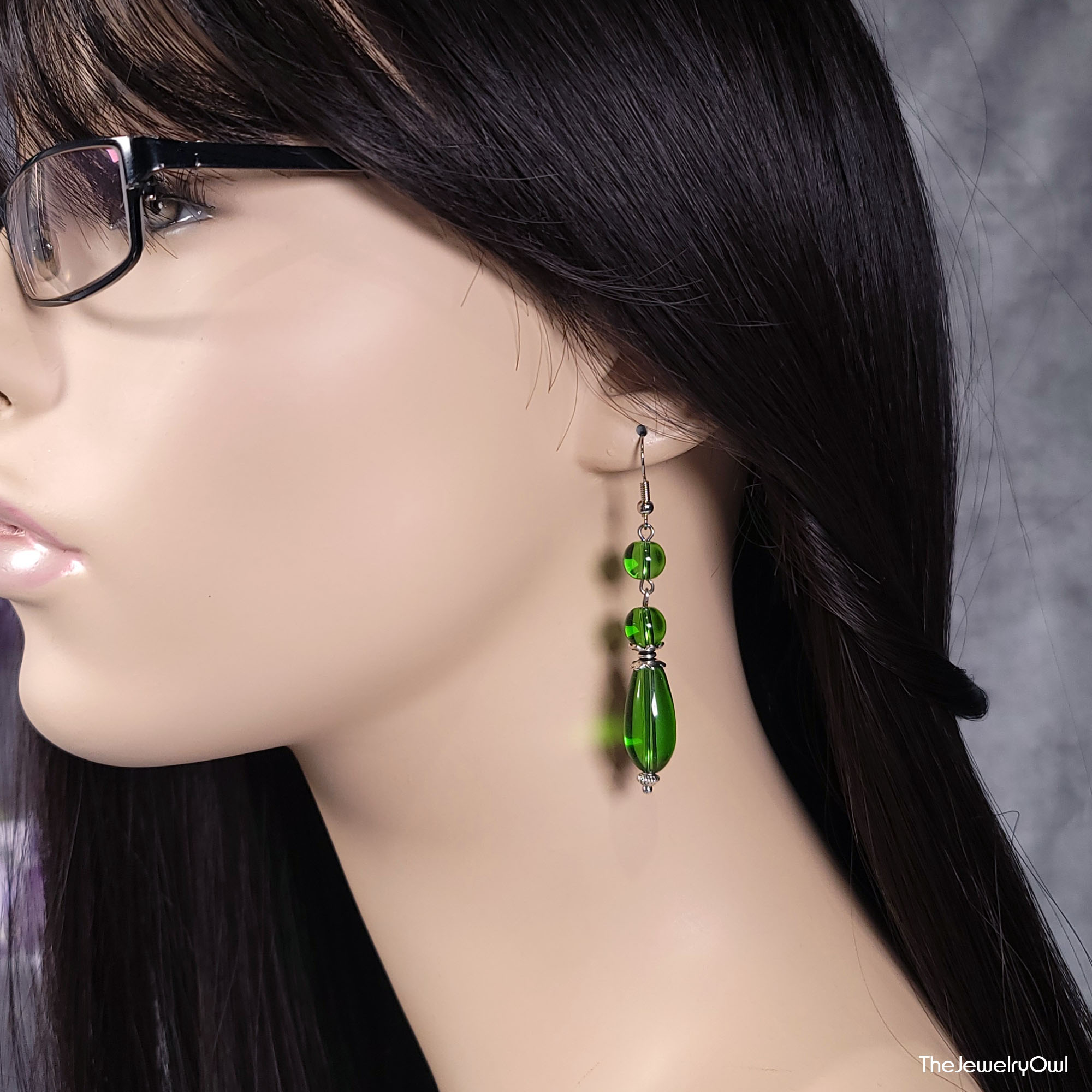 Long glass teardrop dangle earring in bright green. Wear anytime or for that pop of green on Saint Patrick's Day.