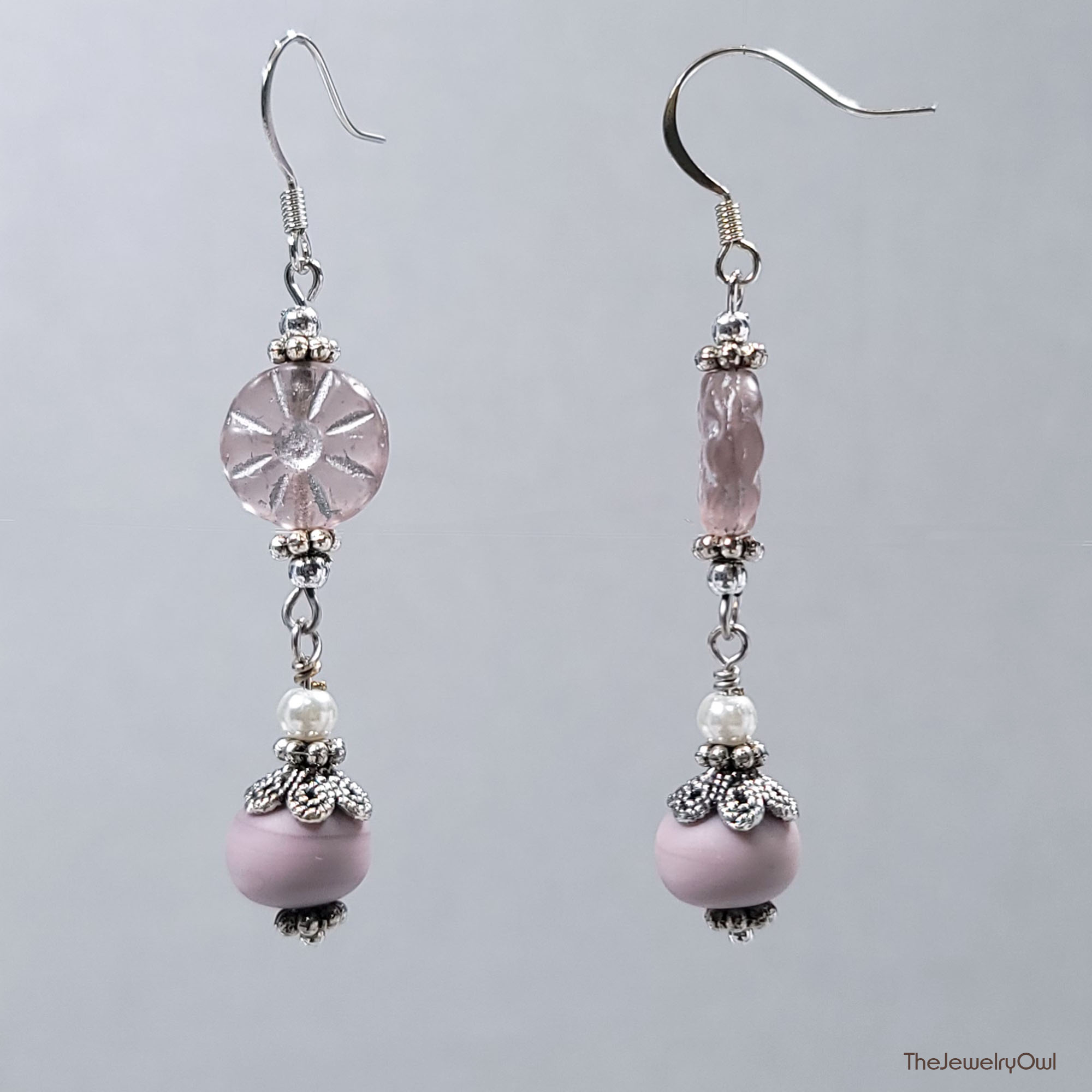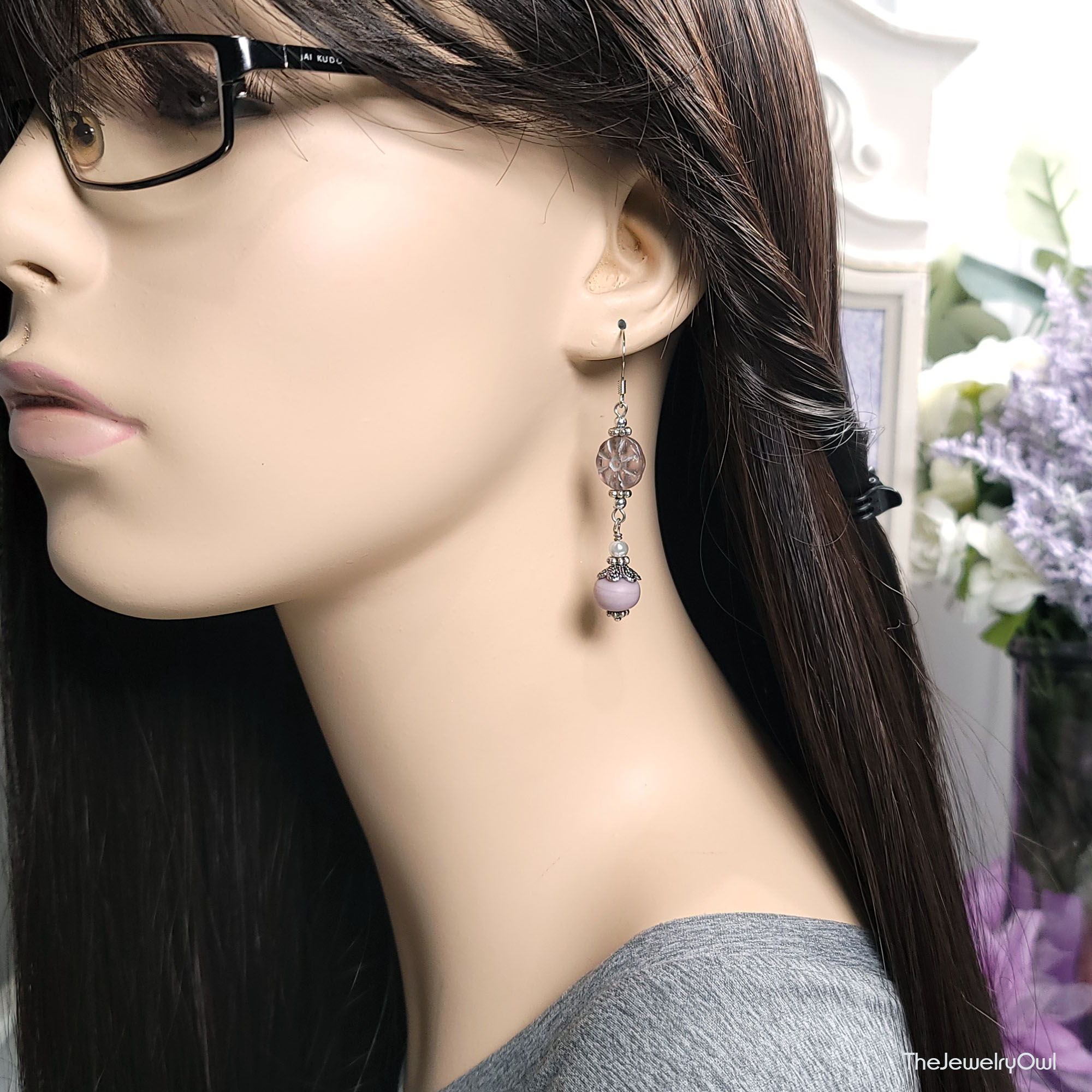 Long dangle earrings feature Czech lavender daisy and glass beads.