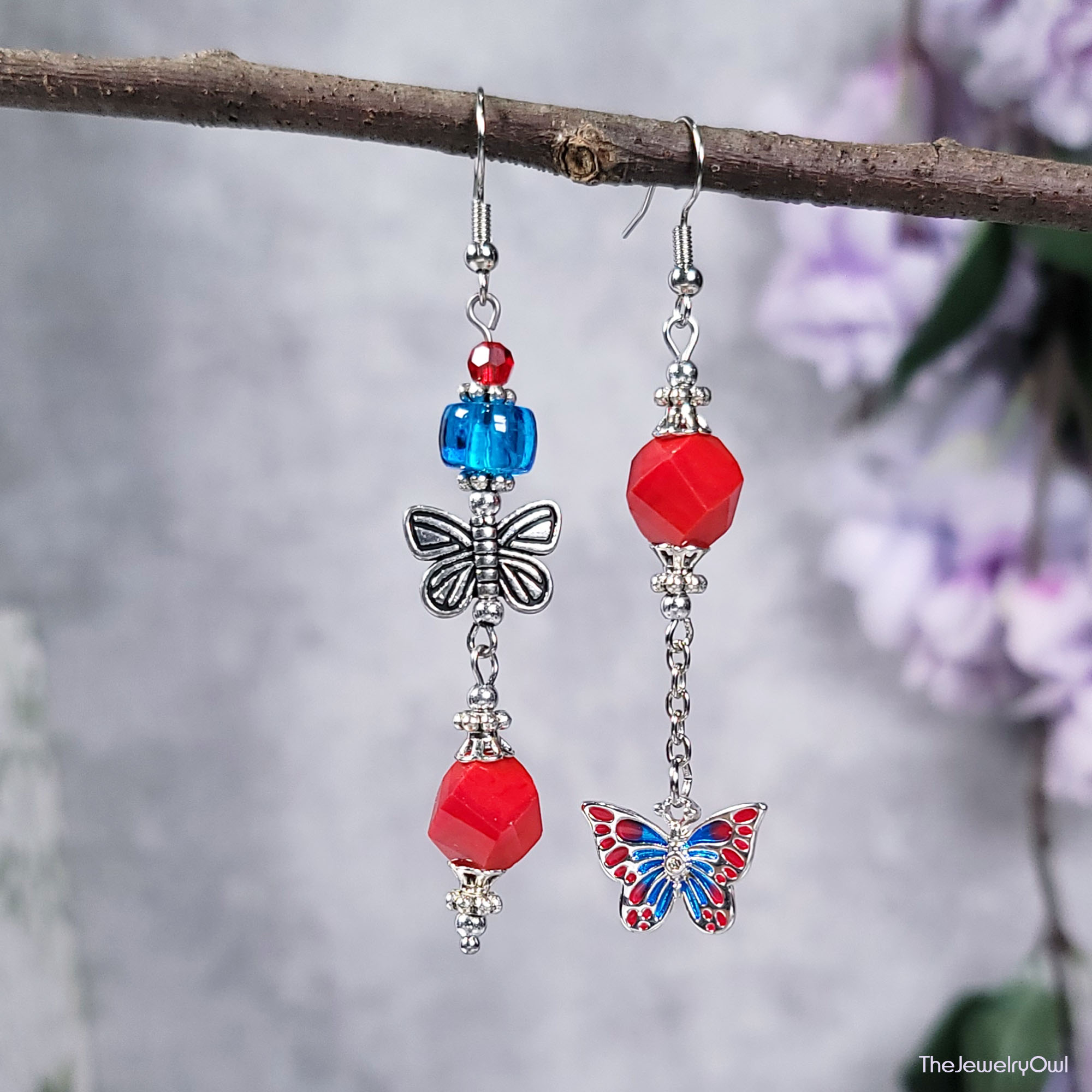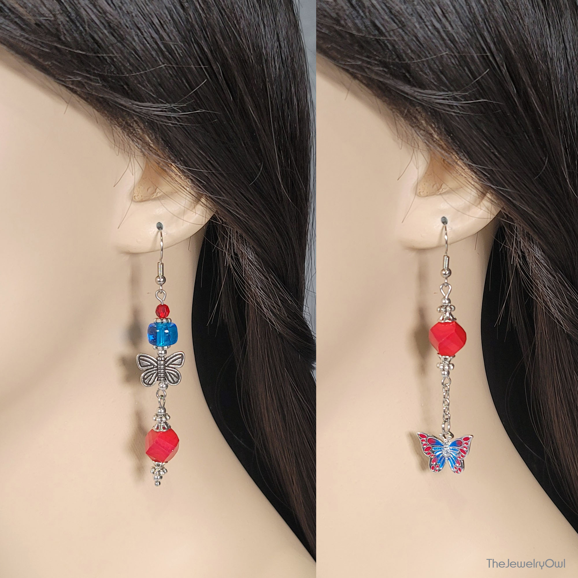 Mismatched red and blue butterfly earrings will add a fun and playful flair to your look.
