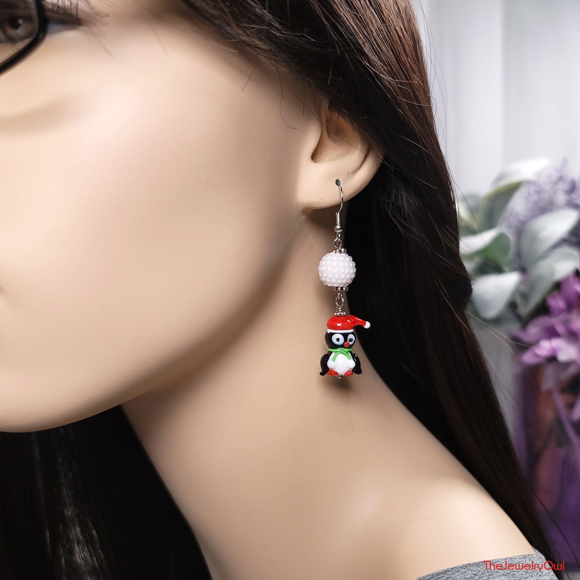 Holiday earrings feature cute glass penguin beads and white bubble gum beads that look like snowballs.