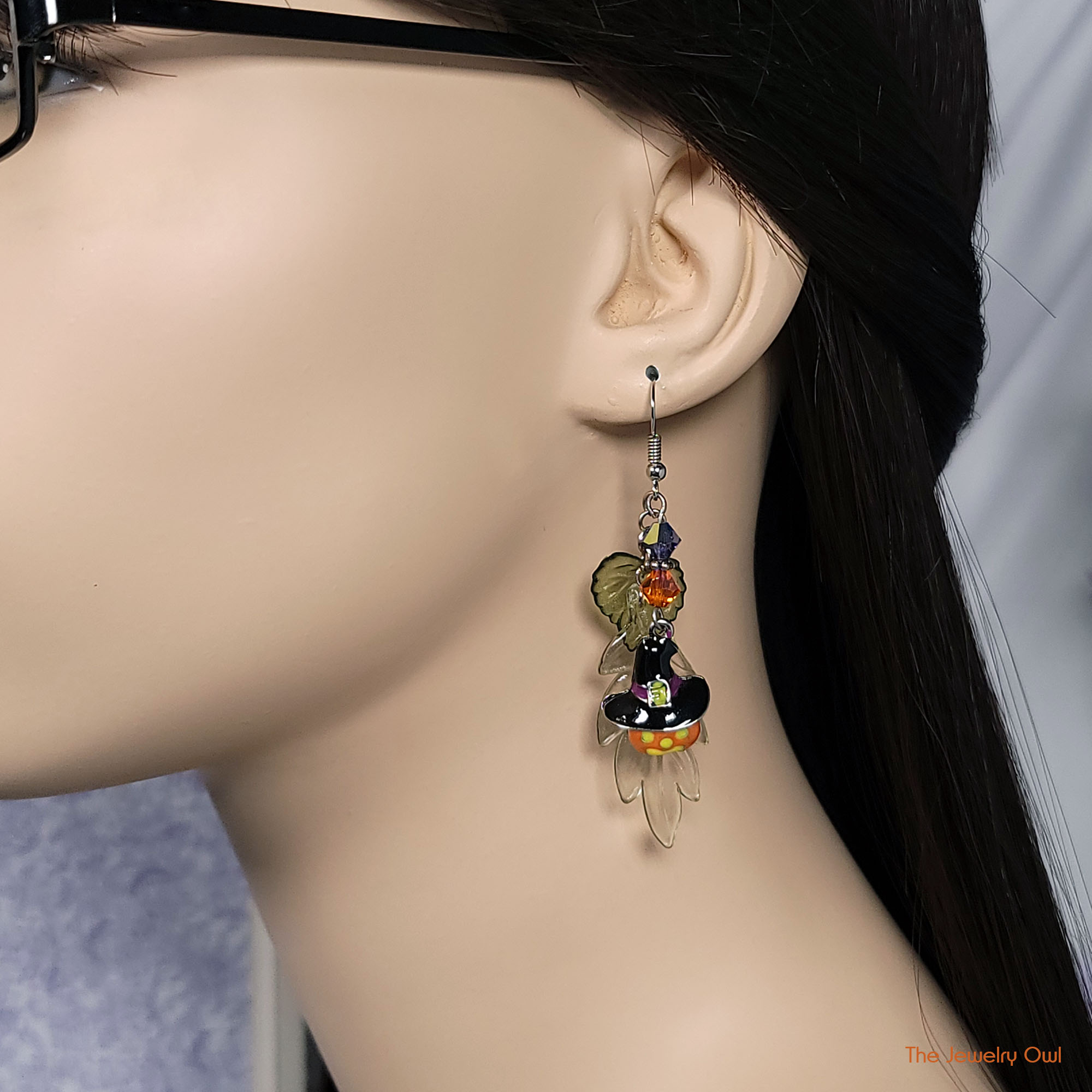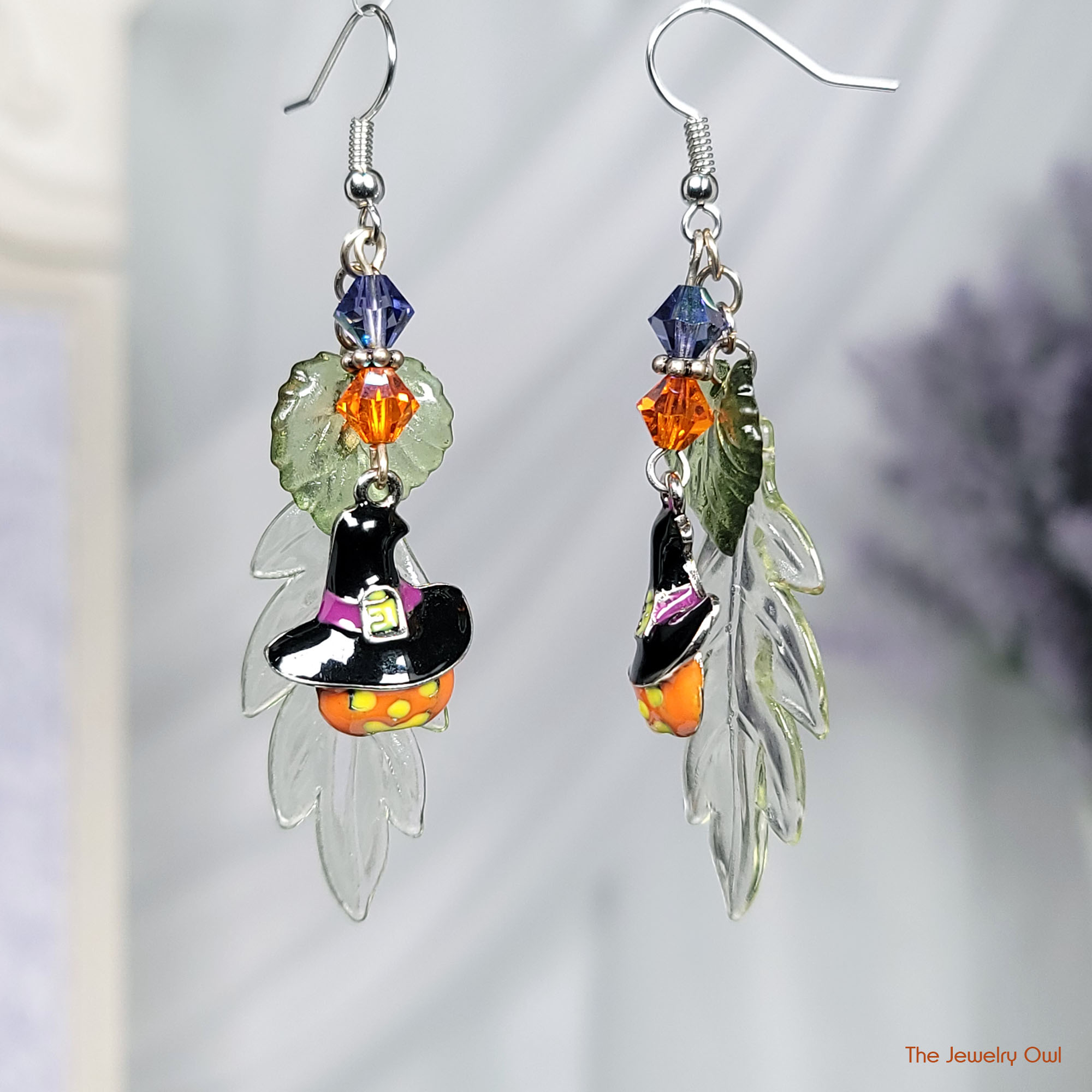 Add a little fun to your attire this Fall with these cute pumpkin witch earrings. Earrings feature acrylic leaves and metal charm and crystal bicones.