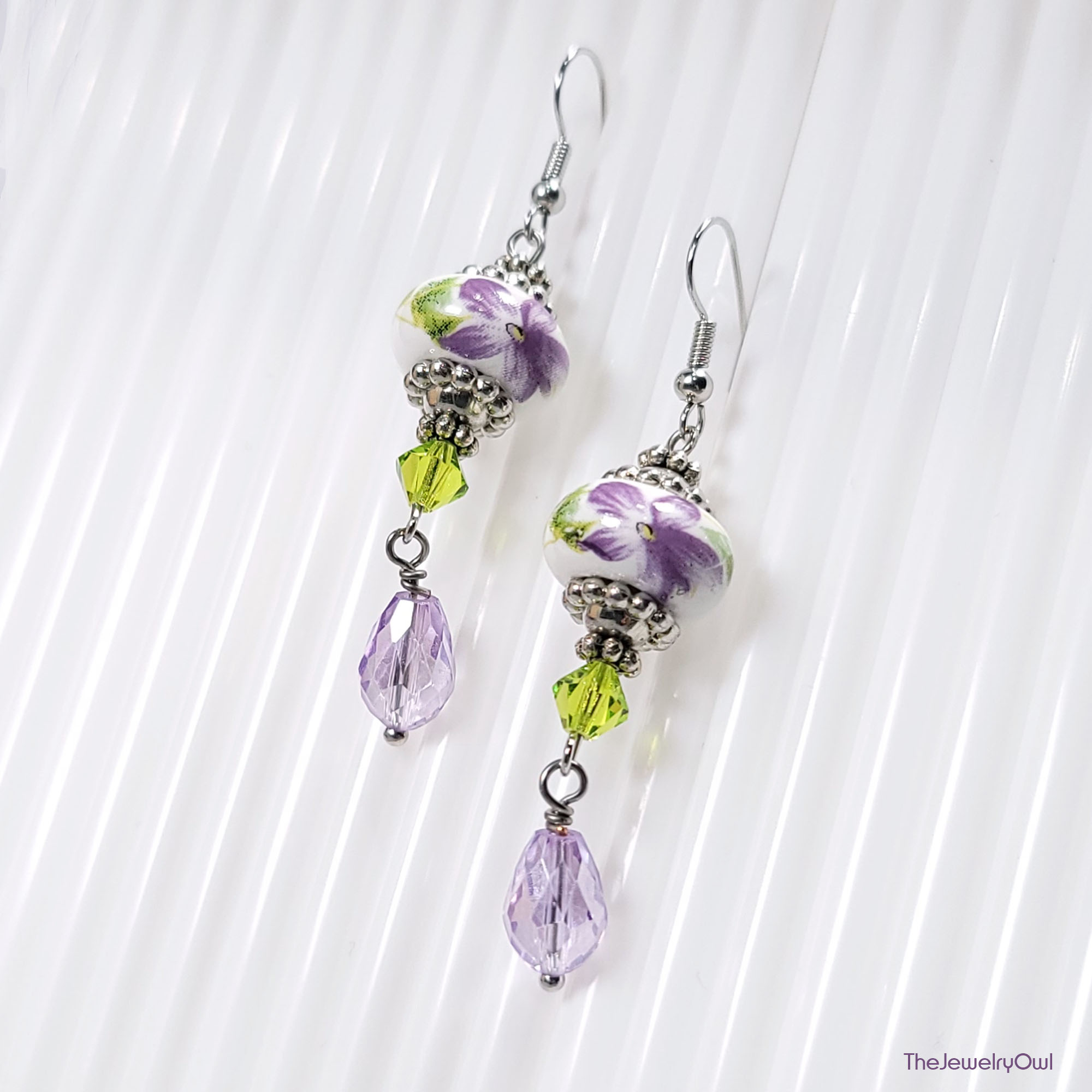 Dangle earrings feature 14mm ceramic white beads with purple flowers and for an added pop of color accented with bright green crystals.