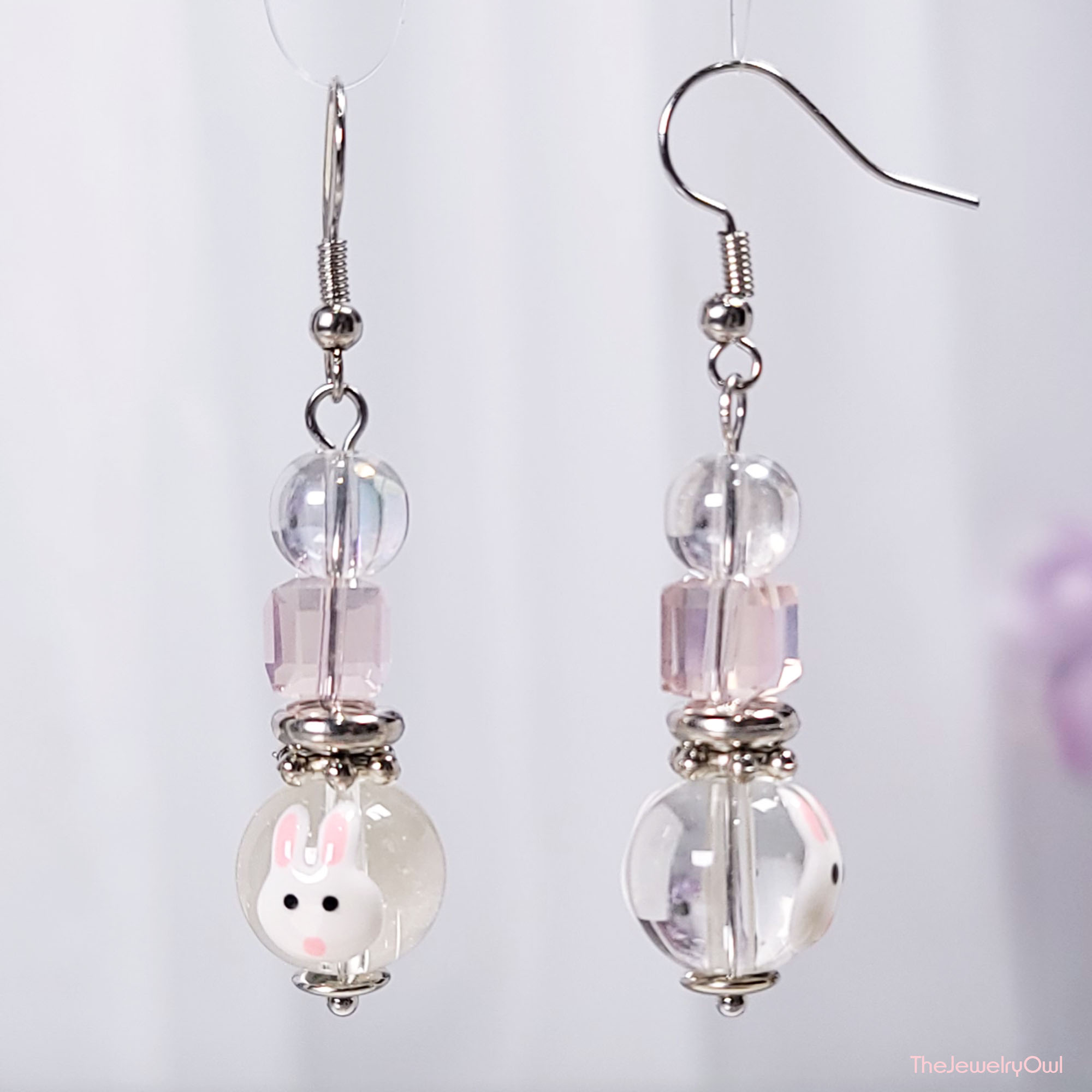 Glass bead earrings feature a white bunny face on clear glass beads.