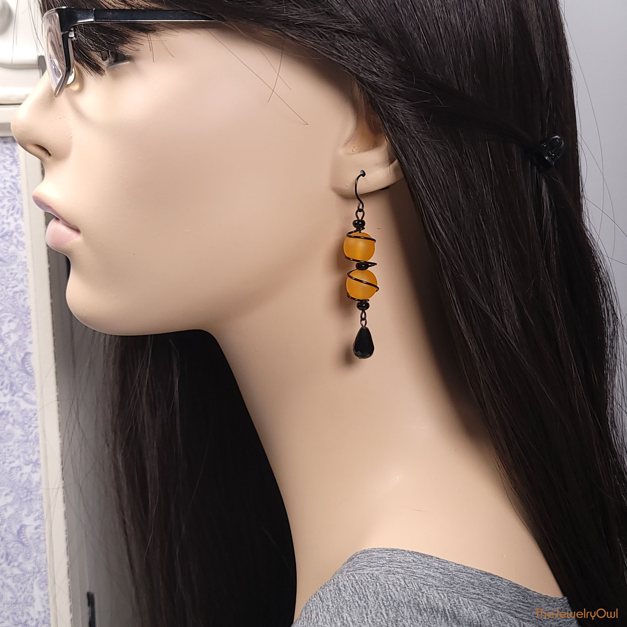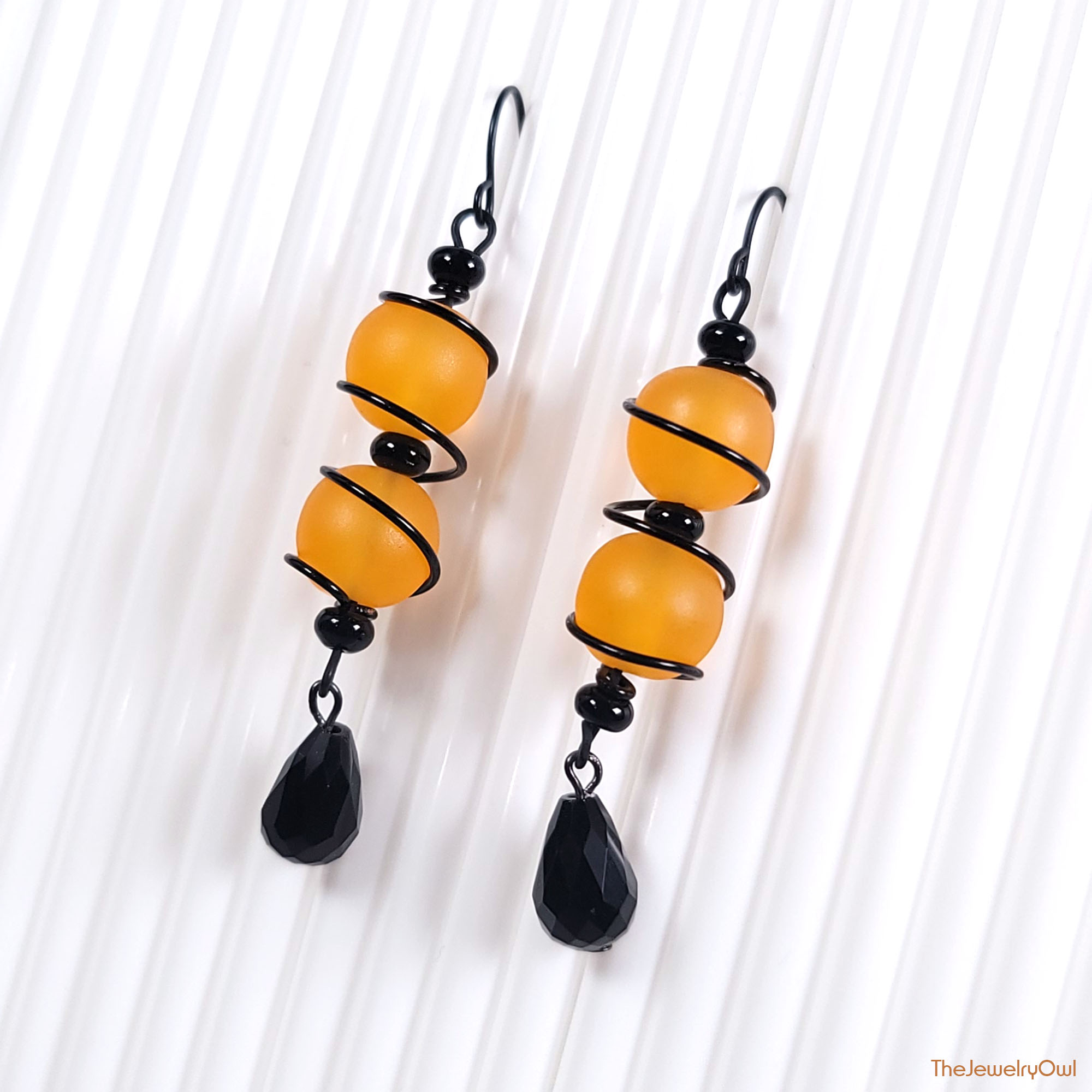 Fun and whimsical, orange and black earrings are hand wire wrapped. The bright orange beads are sure to give you that extra pop of color.