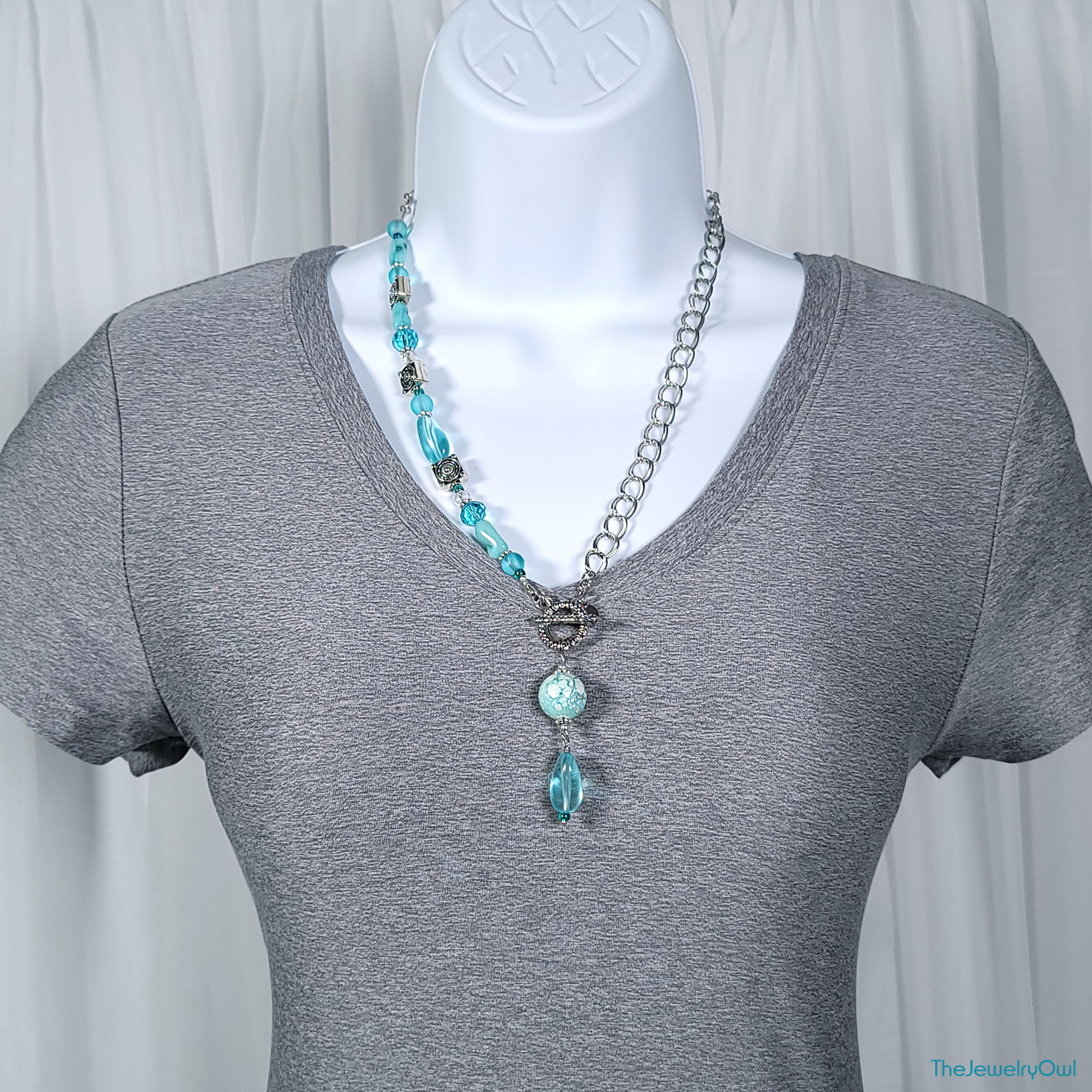 Asymmetrical aqua blue bead and chain pendant necklace features a front toggle clasp, making it easy to but on.