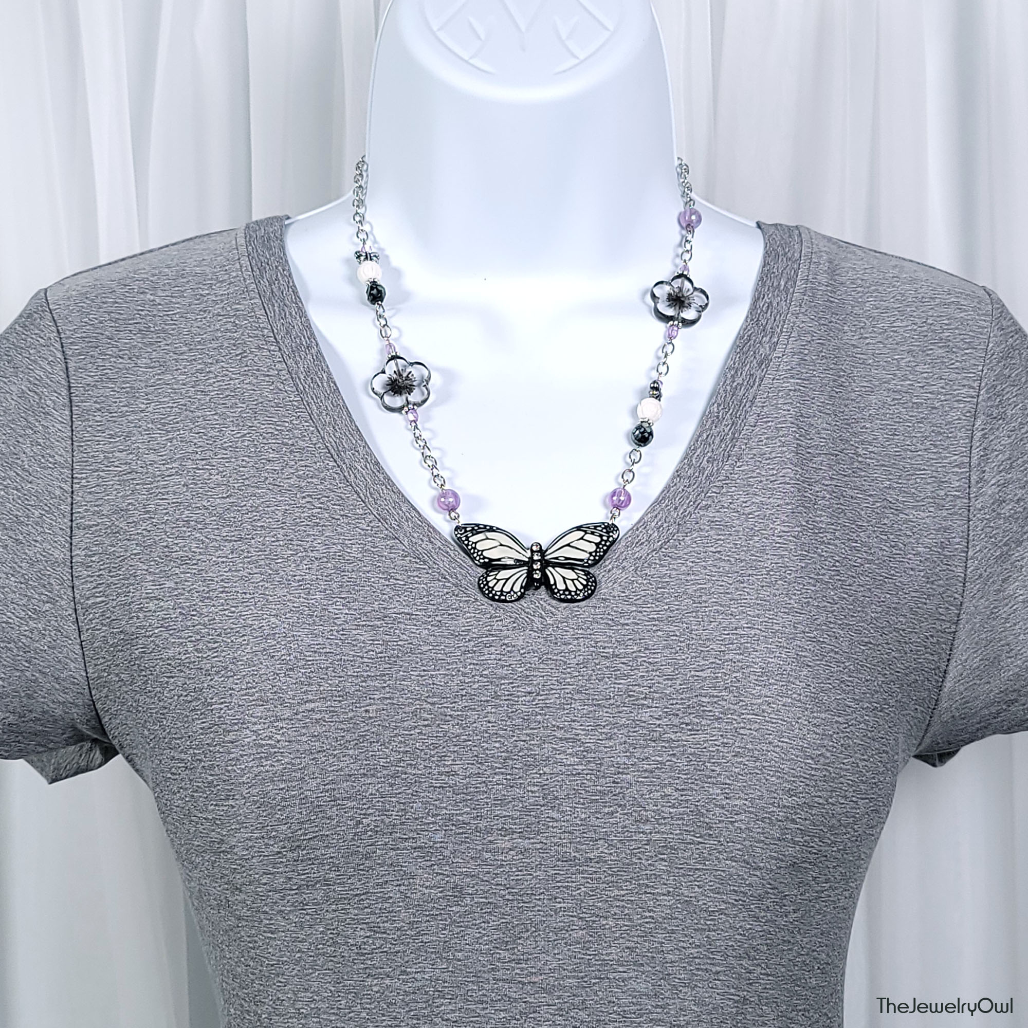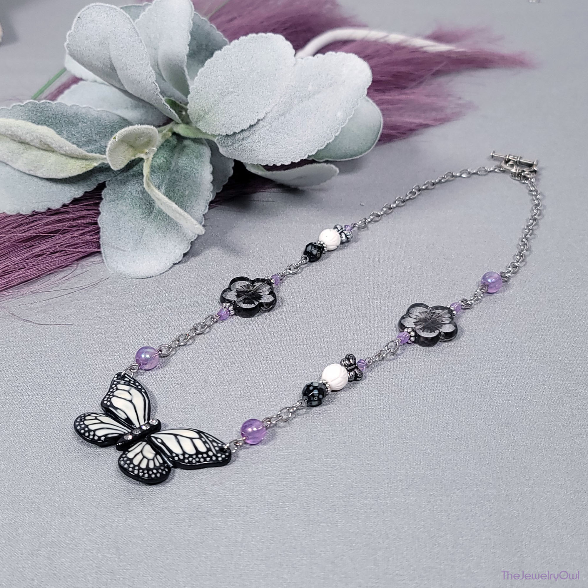 Necklace features a black and white enameled butterfly with rhinestone and black etched Czech clear flowers. And for a hint of color purple glass beads.