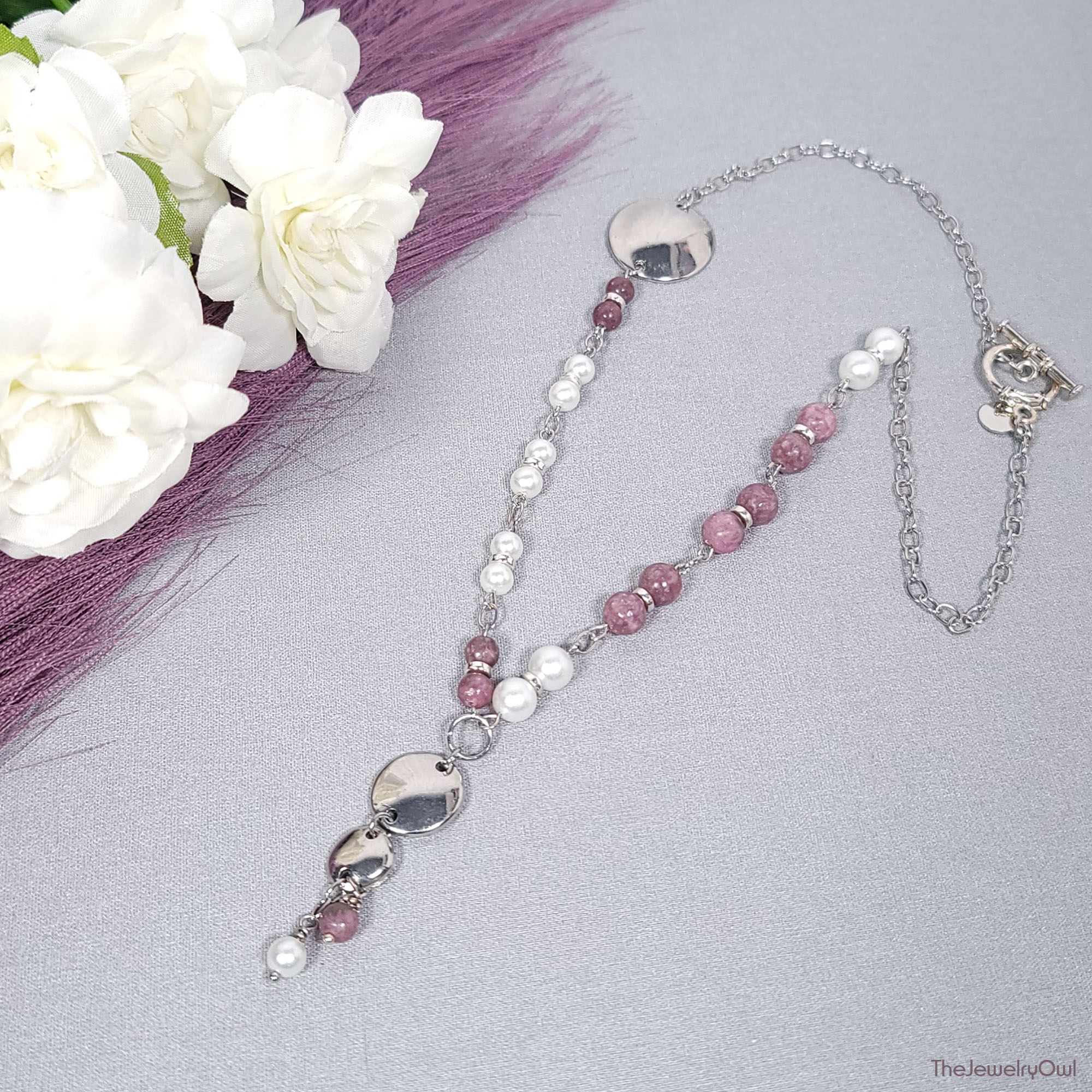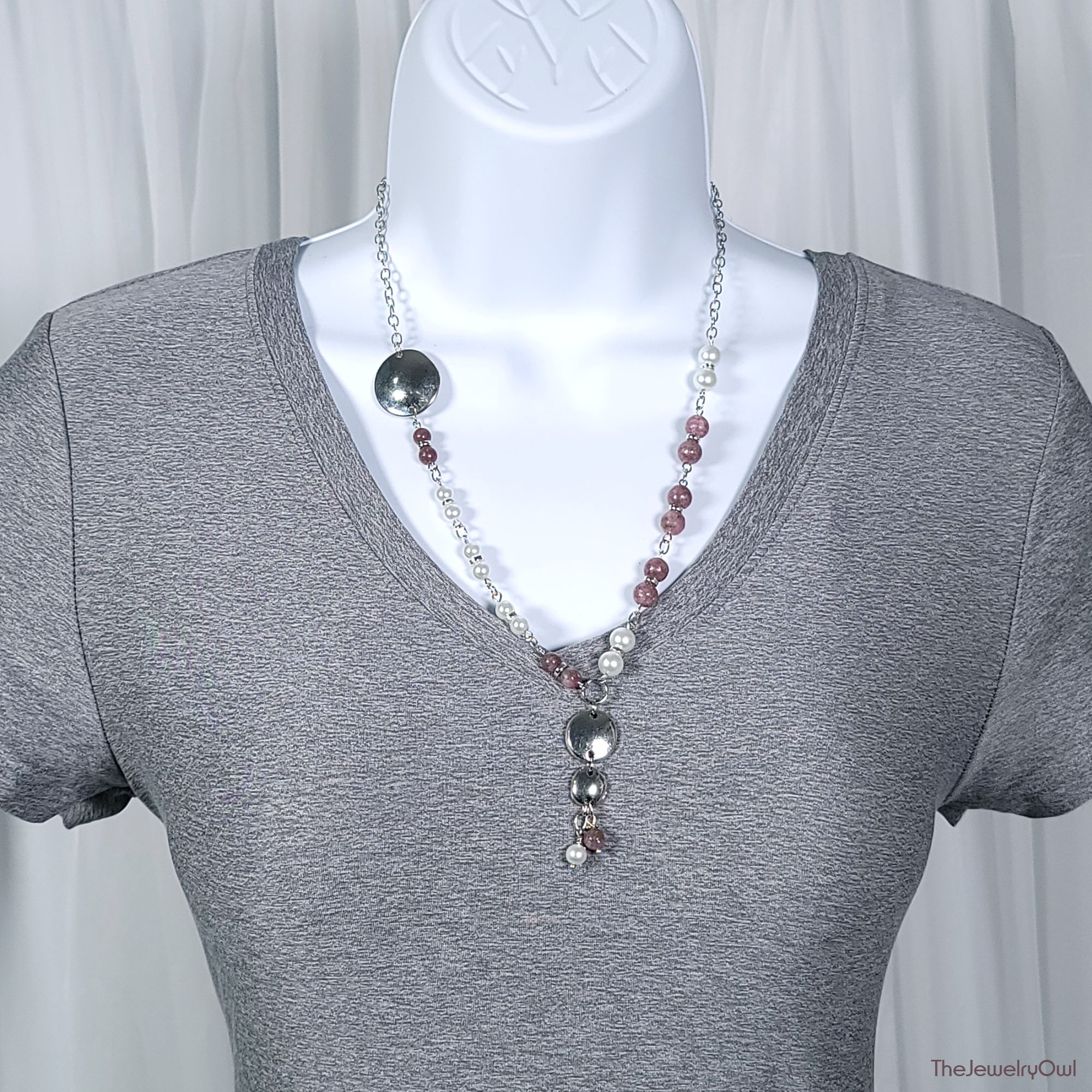 Bead and chain asymmetrical necklace features pink tourmaline gemstone and white glass pearls. Silver disc accent and charm dangle.