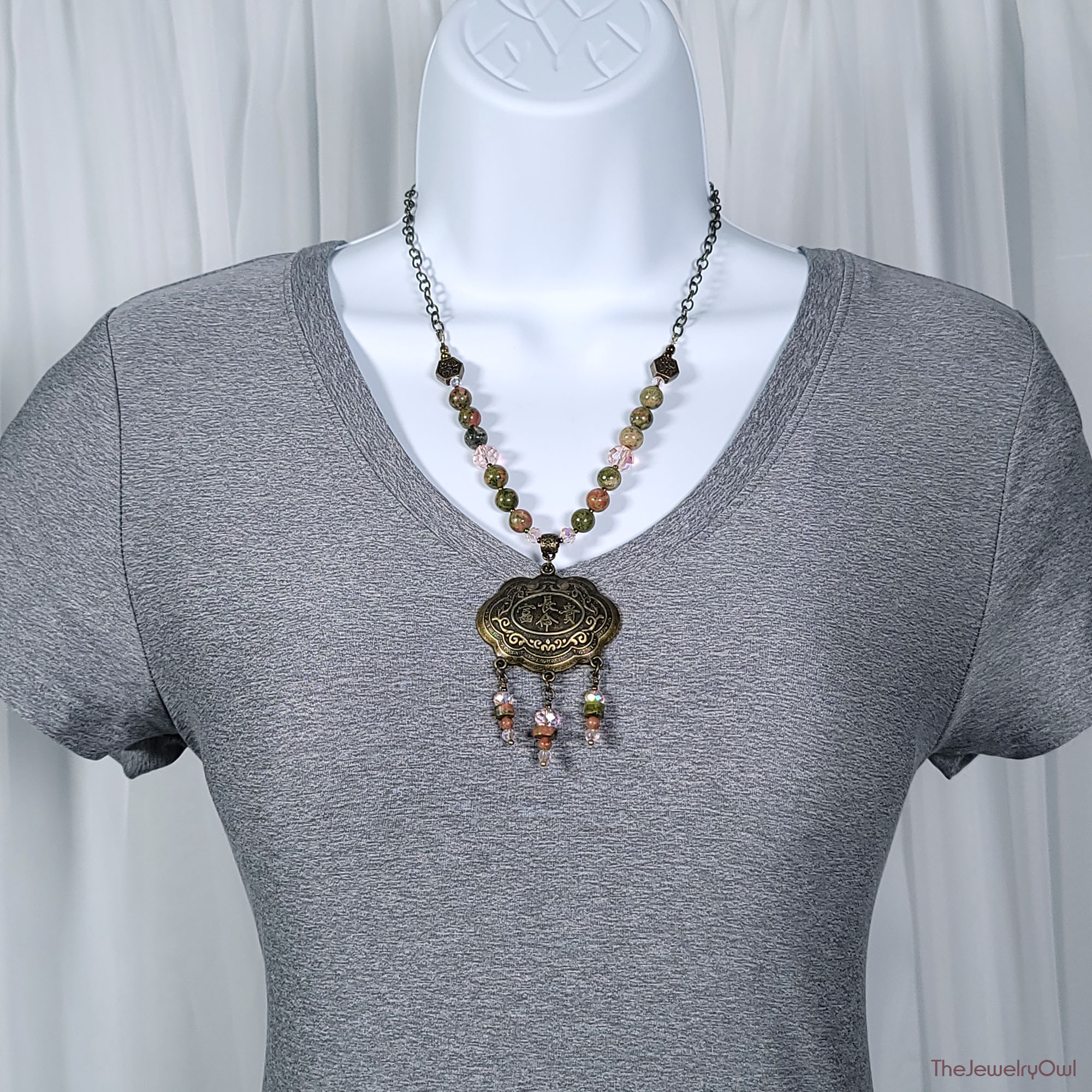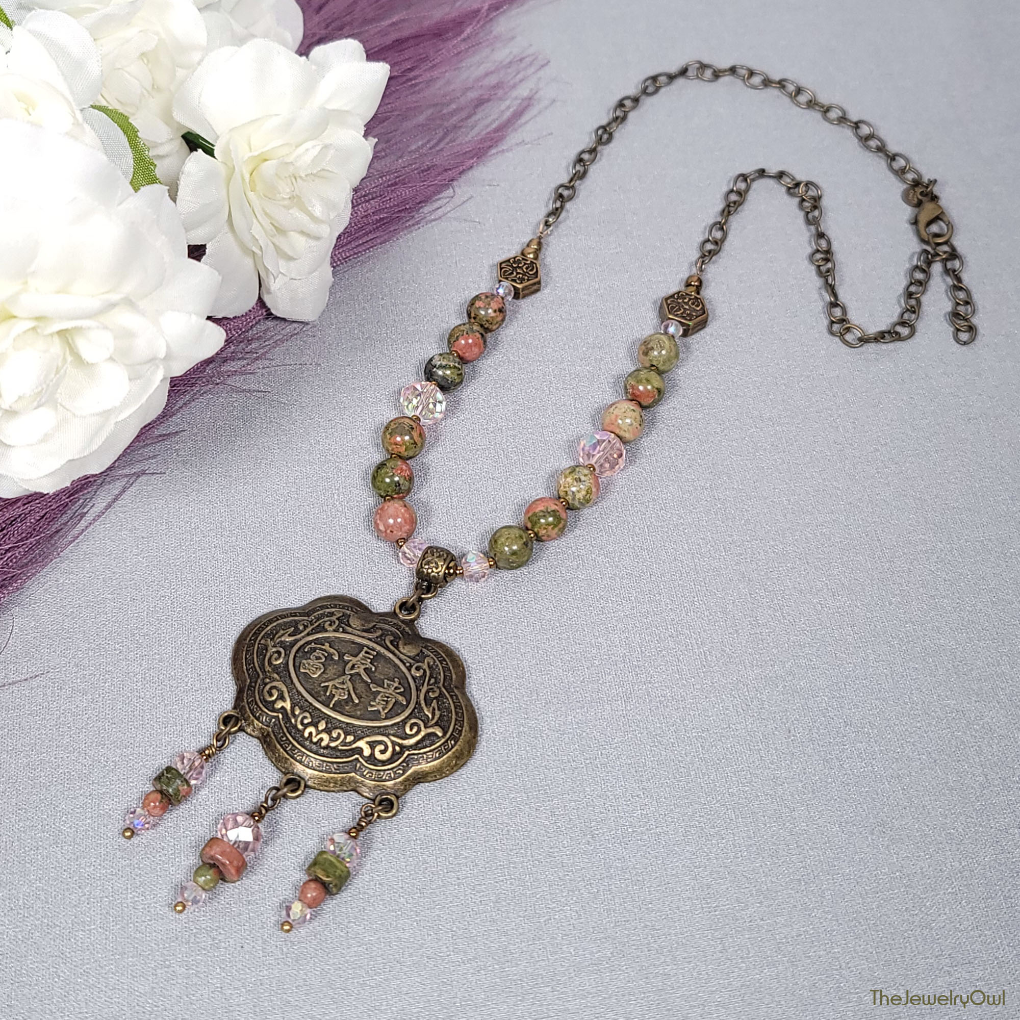 Bead and chain necklaces made with Unakite gemstone with a stunning blend of pink and green hues and accent glass pink faceted rondelle beads for a touch of shimmer. Necklace features an antique brass 2 inch wide pendant with Asian design.