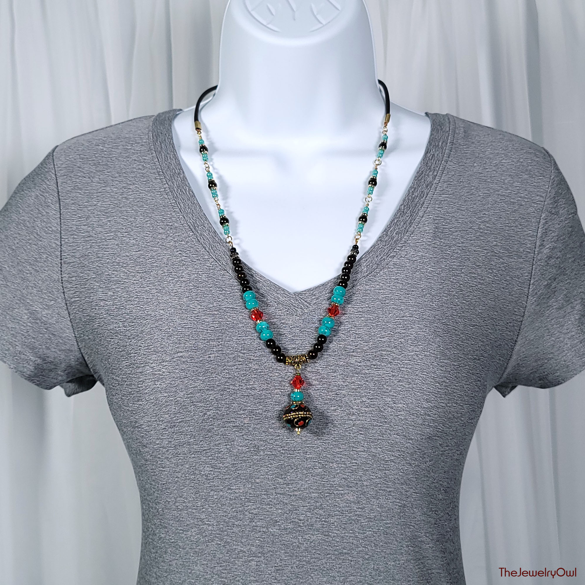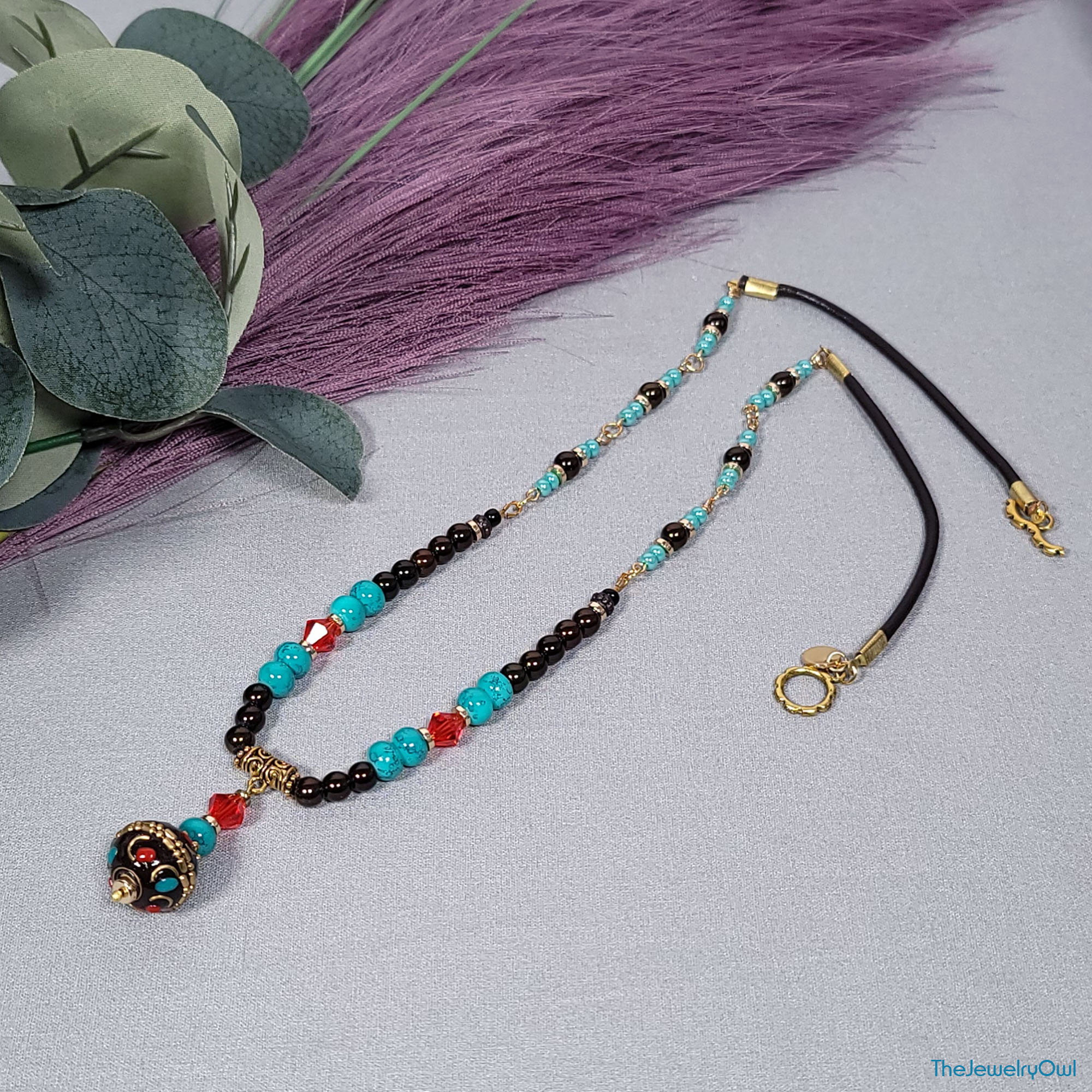 Boho inspired necklace features brown leather cord and an array of brown, red and turquoise glass beads with a large boho bead dangle.
