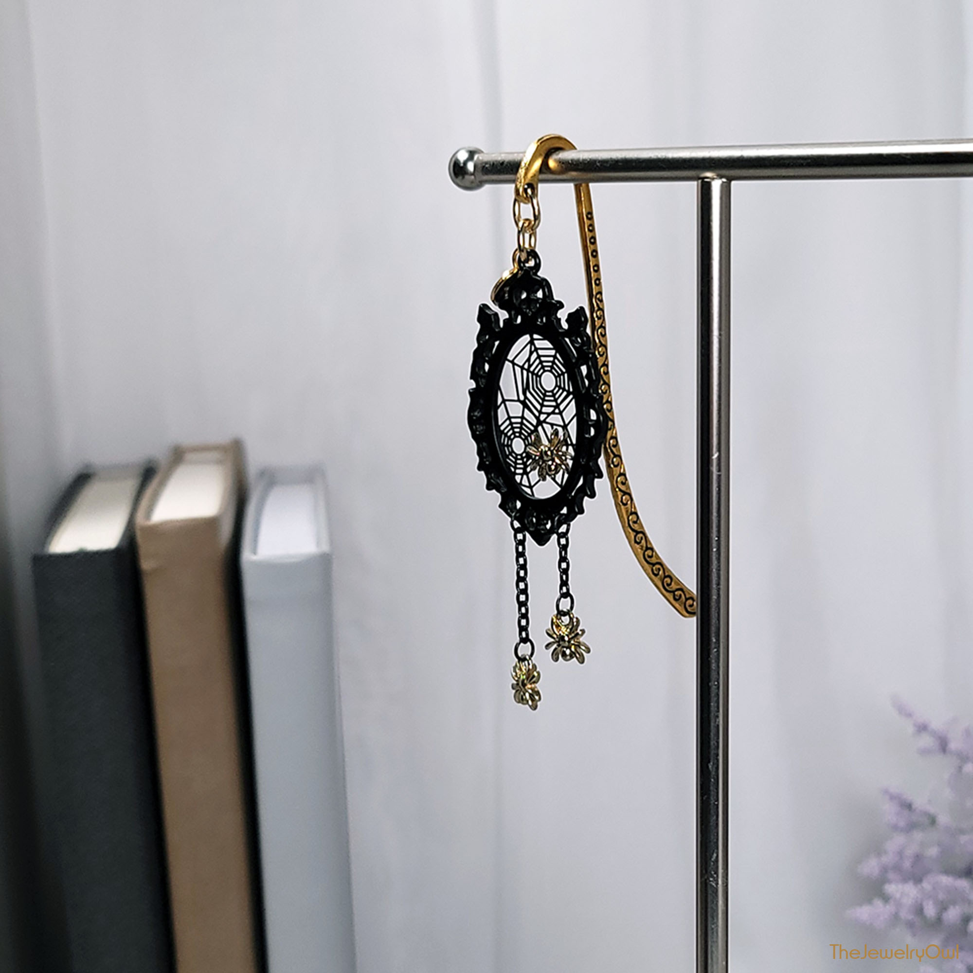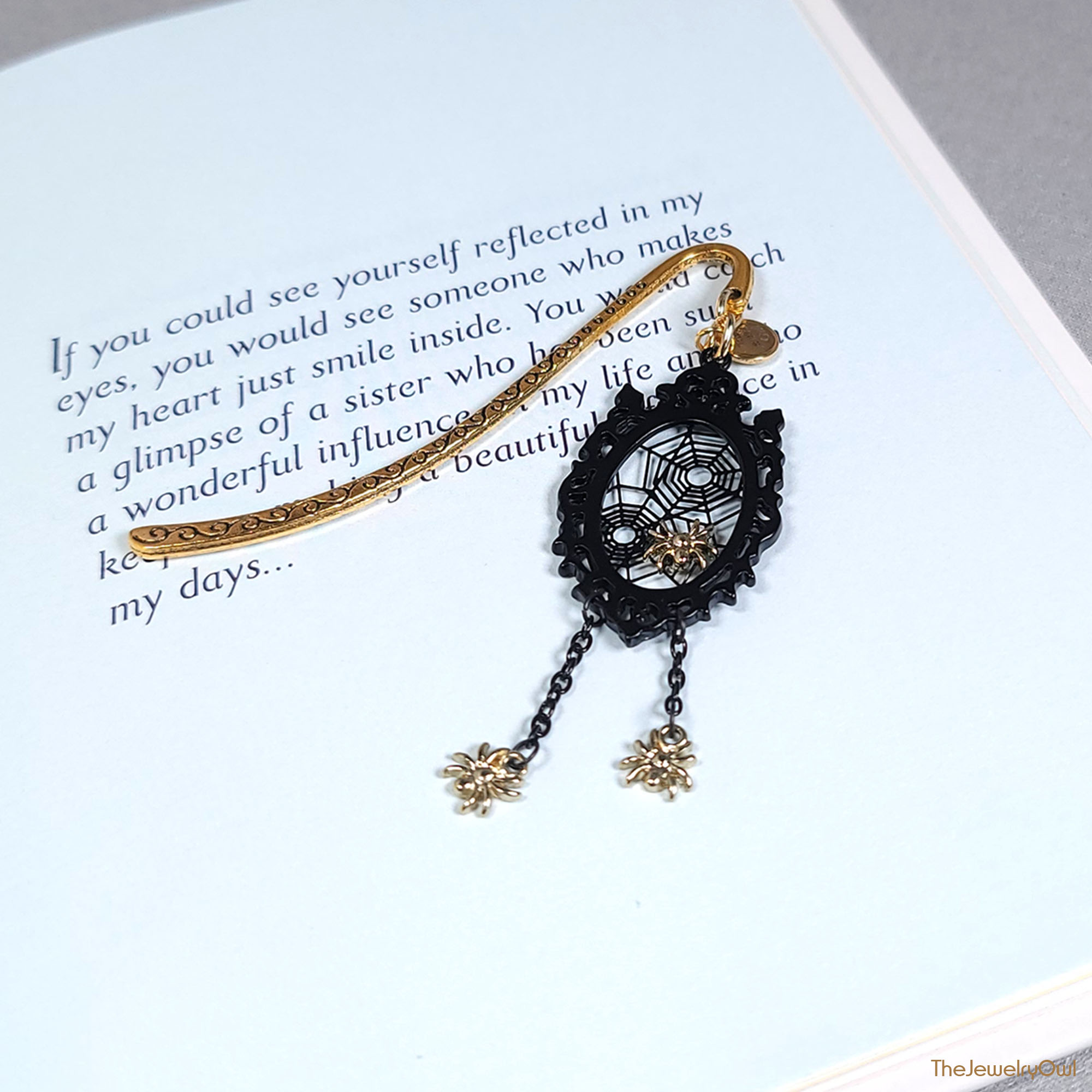 Adorn your favorite scary stories with this black gothic spider web with mini gold-tone spiders shepherd's hook metal bookmark.